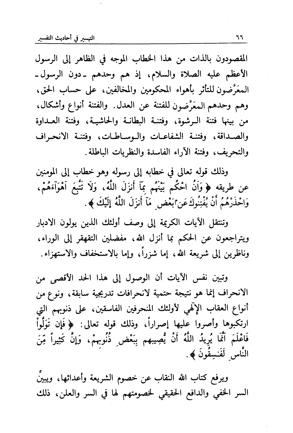 وذلك قوله تعالى في خطابه إلى الرسول وهو خطاب إلى المؤمنين عن طريقه {وَأَنِ احْكُمْ بَيْنَهُمْ بِمَا أَنْزَلَ اللَّهُ وَلَا تَتَّبِعْ أَهْوَاءَهُمْ وَاحْذَرْهُمْ أَنْ يَفْتِنُوكَ عَنْ بَعْضِ مَا أَنْزَلَ اللَّهُ إِلَيْكَ}.