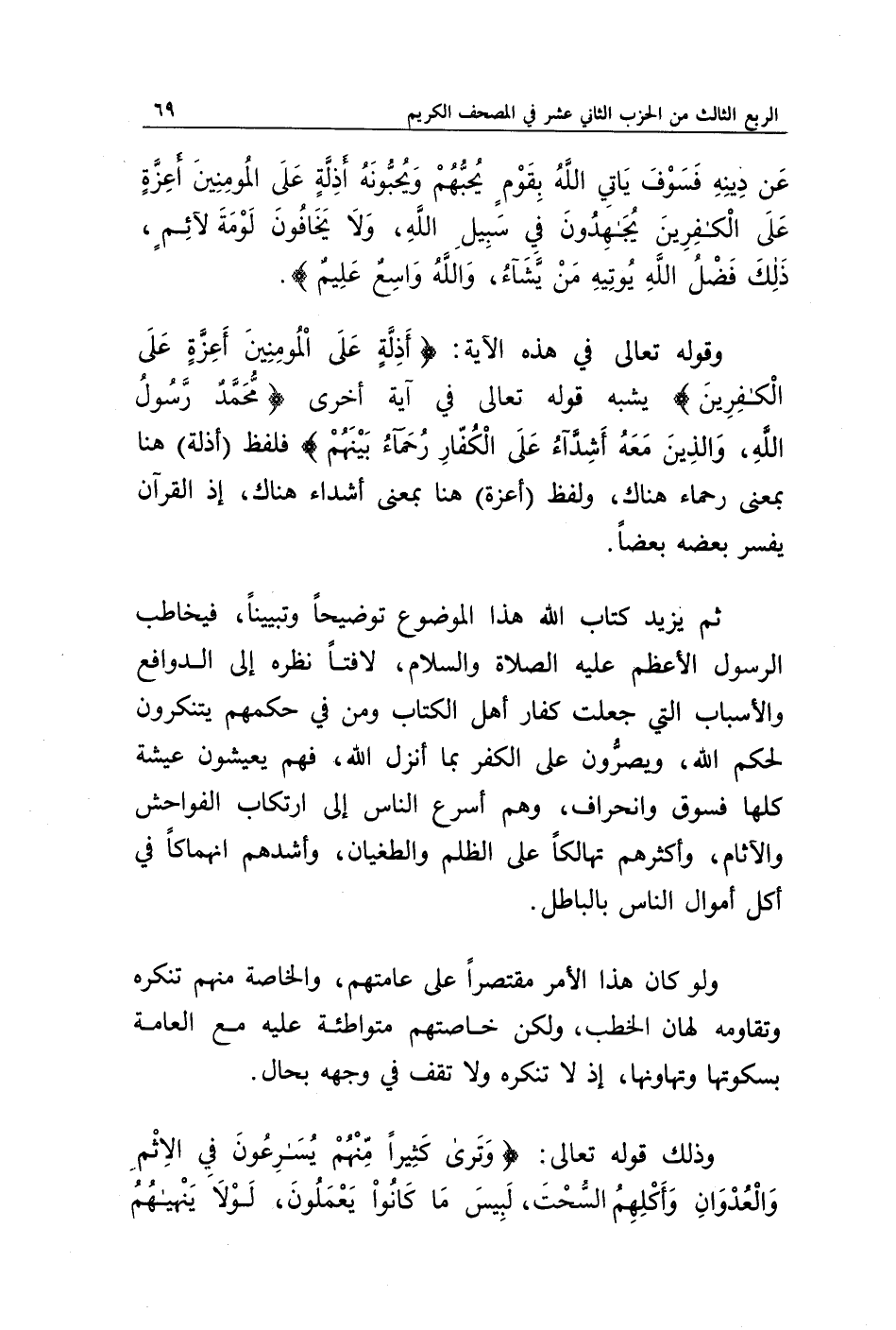 وقوله تعالى في هذه الآية: {أَذِلَّةٍ عَلَى الْمُؤْمِنِينَ أَعِزَّةٍ عَلَى الْكَافِرِينَ} يشبه قوله تعالى في آية أخرى {مُحَمَّدٌ رَسُولُ اللَّهِ وَالَّذِينَ مَعَهُ أَشِدَّاءُ عَلَى الْكُفَّارِ رُحَمَاءُ بَيْنَهُمْ} فلفظ {أَذِلَّةٍ} هنا بمعنى رحماء هناك، ولفظ {أَعِزَّةٍ} هنا بمعنى أشداء هناك، إذ القرآن يفسر بعضه بعضا.