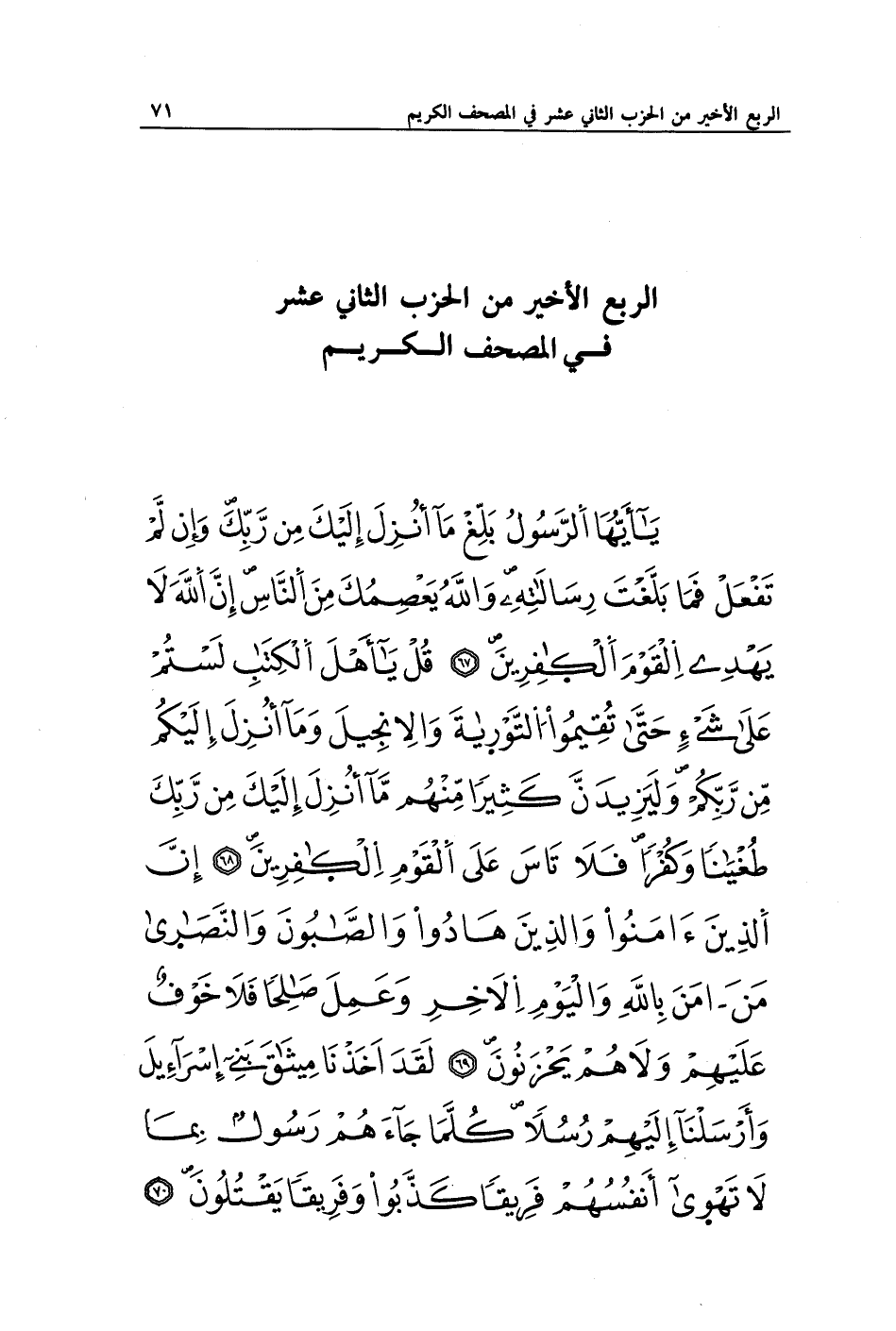 يَا أَيُّهَا الرَّسُولُ بَلِّغْ مَا أُنْزِلَ إِلَيْكَ مِنْ رَبِّكَ وَإِنْ لَمْ تَفْعَلْ فَمَا بَلَّغْتَ رِسَالَتَهُ وَاللَّهُ يَعْصِمُكَ مِنَ النَّاسِ إِنَّ اللَّهَ لَا يَهْدِي الْقَوْمَ الْكَافِرِينَ (67) قُلْ يَا أَهْلَ الْكِتَابِ لَسْتُمْ عَلَى شَيْءٍ حَتَّى تُقِيمُوا التَّوْرَاةَ وَالْإِنْجِيلَ وَمَا أُنْزِلَ إِلَيْكُمْ مِنْ رَبِّكُمْ وَلَيَزِيدَنَّ كَثِيرًا مِنْهُمْ مَا أُنْزِلَ إِلَيْكَ مِنْ رَبِّكَ طُغْيَانًا وَكُفْرًا فَلَا تَأْسَ عَلَى الْقَوْمِ الْكَافِرِينَ (68) إِنَّ الَّذِينَ آمَنُوا وَالَّذِينَ هَادُوا وَالصَّابِئُونَ وَالنَّصَارَى مَنْ آمَنَ بِاللَّهِ وَالْيَوْمِ الْآخِرِ وَعَمِلَ صَالِحًا فَلَا خَوْفٌ عَلَيْهِمْ وَلَا هُمْ يَحْزَنُونَ (69) لَقَدْ أَخَذْنَا مِيثَاقَ بَنِي إِسْرَائِيلَ وَأَرْسَلْنَا إِلَيْهِمْ رُسُلًا كُلَّمَا جَاءَهُمْ رَسُولٌ بِمَا لَا تَهْوَى أَنْفُسُهُمْ فَرِيقًا كَذَّبُوا وَفَرِيقًا يَقْتُلُونَ (70)