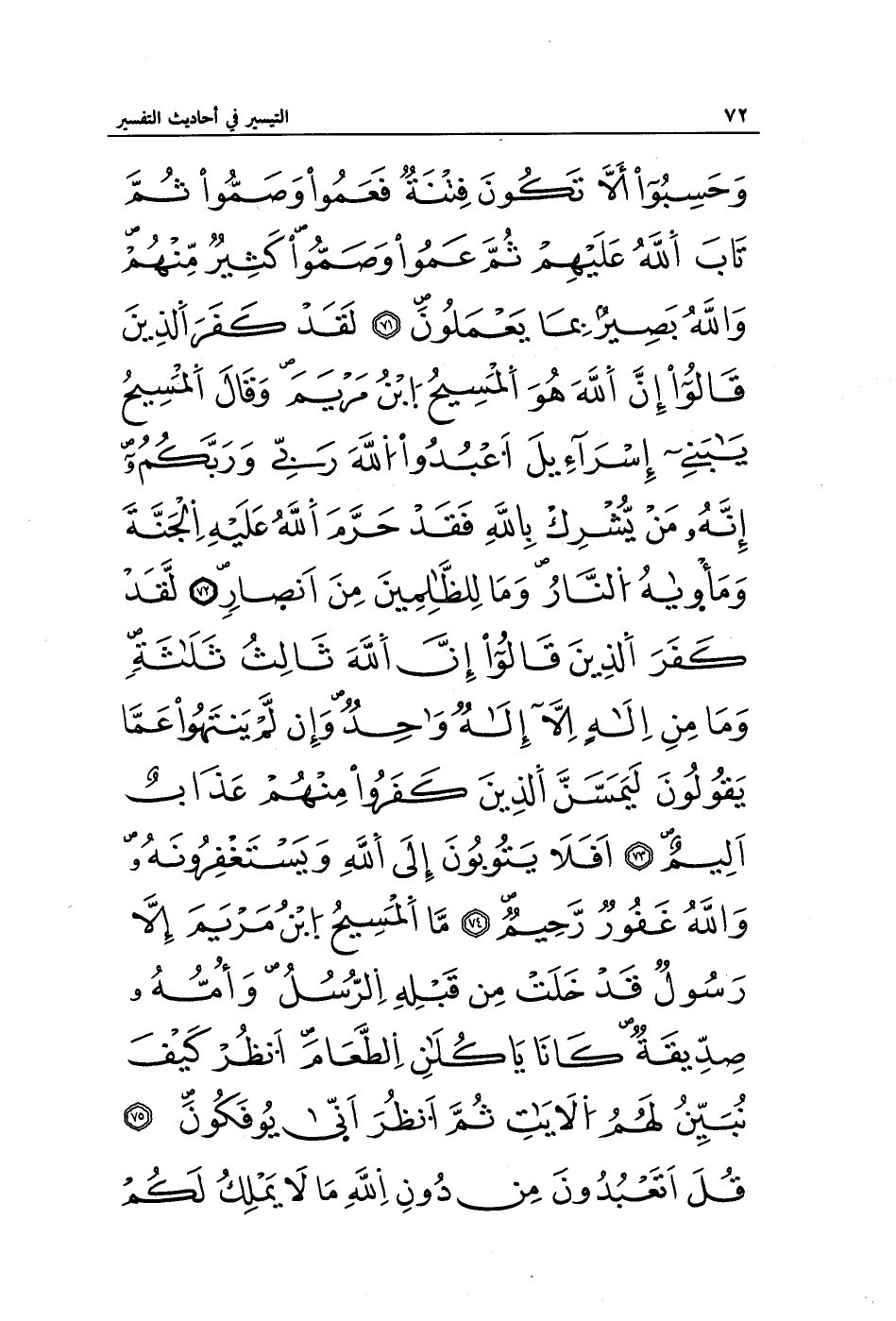 وَحَسِبُوا أَلَّا تَكُونَ فِتْنَةٌ فَعَمُوا وَصَمُّوا ثُمَّ تَابَ اللَّهُ عَلَيْهِمْ ثُمَّ عَمُوا وَصَمُّوا كَثِيرٌ مِنْهُمْ وَاللَّهُ بَصِيرٌ بِمَا يَعْمَلُونَ (71) لَقَدْ كَفَرَ الَّذِينَ قَالُوا إِنَّ اللَّهَ هُوَ الْمَسِيحُ ابْنُ مَرْيَمَ وَقَالَ الْمَسِيحُ يَا بَنِي إِسْرَائِيلَ اعْبُدُوا اللَّهَ رَبِّي وَرَبَّكُمْ إِنَّهُ مَنْ يُشْرِكْ بِاللَّهِ فَقَدْ حَرَّمَ اللَّهُ عَلَيْهِ الْجَنَّةَ وَمَأْوَاهُ النَّارُ وَمَا لِلظَّالِمِينَ مِنْ أَنْصَارٍ (72) لَقَدْ كَفَرَ الَّذِينَ قَالُوا إِنَّ اللَّهَ ثَالِثُ ثَلَاثَةٍ وَمَا مِنْ إِلَهٍ إِلَّا إِلَهٌ وَاحِدٌ وَإِنْ لَمْ يَنْتَهُوا عَمَّا يَقُولُونَ لَيَمَسَّنَّ الَّذِينَ كَفَرُوا مِنْهُمْ عَذَابٌ أَلِيمٌ (73) أَفَلَا يَتُوبُونَ إِلَى اللَّهِ وَيَسْتَغْفِرُونَهُ وَاللَّهُ غَفُورٌ رَحِيمٌ (74) مَا الْمَسِيحُ ابْنُ مَرْيَمَ إِلَّا رَسُولٌ قَدْ خَلَتْ مِنْ قَبْلِهِ الرُّسُلُ وَأُمُّهُ صِدِّيقَةٌ كَانَا يَأْكُلَانِ الطَّعَامَ انْظُرْ كَيْفَ نُبَيِّنُ لَهُمُ الْآيَاتِ ثُمَّ انْظُرْ أَنَّى يُؤْفَكُونَ (75) قُلْ أَتَعْبُدُونَ مِنْ دُونِ اللَّهِ مَا لَا يَمْلِكُ لَكُمْ
