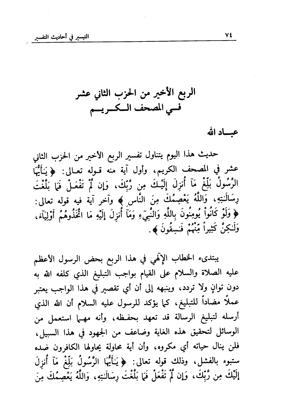 حديث هذا اليوم يتناول تفسير الربع الأخير من الحزب الثاني عشر في المصحف الكريم، وأول آية منه قوله تعالى: {يَا أَيُّهَا الرَّسُولُ بَلِّغْ مَا أُنْزِلَ إِلَيْكَ مِنْ رَبِّكَ وَإِنْ لَمْ تَفْعَلْ فَمَا بَلَّغْتَ رِسَالَتَهُ وَاللَّهُ يَعْصِمُكَ مِنَ النَّاسِ} وآخر آية فيه قوله تعالى: {وَلَوْ كَانُوا يُؤْمِنُونَ بِاللَّهِ وَالنَّبِيِّ وَمَا أُنْزِلَ إِلَيْهِ مَا اتَّخَذُوهُمْ أَوْلِيَاءَ وَلَكِنَّ كَثِيرًا مِنْهُمْ فَاسِقُونَ}.
