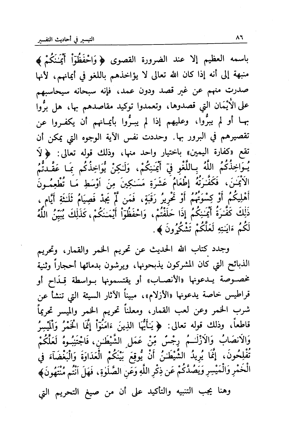 باسمه العظيم إلا عند الضرورة القصوى {وَاحْفَظُوا أَيْمَانَكُمْ} منبهة إلى أنه إذا كان الله تعالى لا يؤاخذهم باللغو في أيمانهم، لأنها صدرت منهم عن غير قصد ودون عمد، فإنه سبحانه سيحاسبهم على الأيمان التي قصدوها، وتعمدوا توكيد مقاصدهم بها هل بروا بها أو لم يبروا، وعليهم إذا لم يبروا بأيمانهم أن يكفروا عن تقصيرهم في البرور بها. وحددت نفس الآية الوجوه التي يمكن أن تقع {كفارة اليمين} باختيار واحد منها، وذلك قوله تعالى: {لَا يُؤَاخِذُكُمُ اللَّهُ بِاللَّغْوِ فِي أَيْمَانِكُمْ وَلَكِنْ يُؤَاخِذُكُمْ بِمَا عَقَّدْتُمُ الْأَيْمَانَ فَكَفَّارَتُهُ إِطْعَامُ عَشَرَةِ مَسَاكِينَ مِنْ أَوْسَطِ مَا تُطْعِمُونَ أَهْلِيكُمْ أَوْ كِسْوَتُهُمْ أَوْ تَحْرِيرُ رَقَبَةٍ فَمَنْ لَمْ يَجِدْ فَصِيَامُ ثَلَاثَةِ أَيَّامٍ ذَلِكَ كَفَّارَةُ أَيْمَانِكُمْ إِذَا حَلَفْتُمْ وَاحْفَظُوا أَيْمَانَكُمْ كَذَلِكَ يُبَيِّنُ اللَّهُ لَكُمْ آيَاتِهِ لَعَلَّكُمْ تَشْكُرُونَ}.