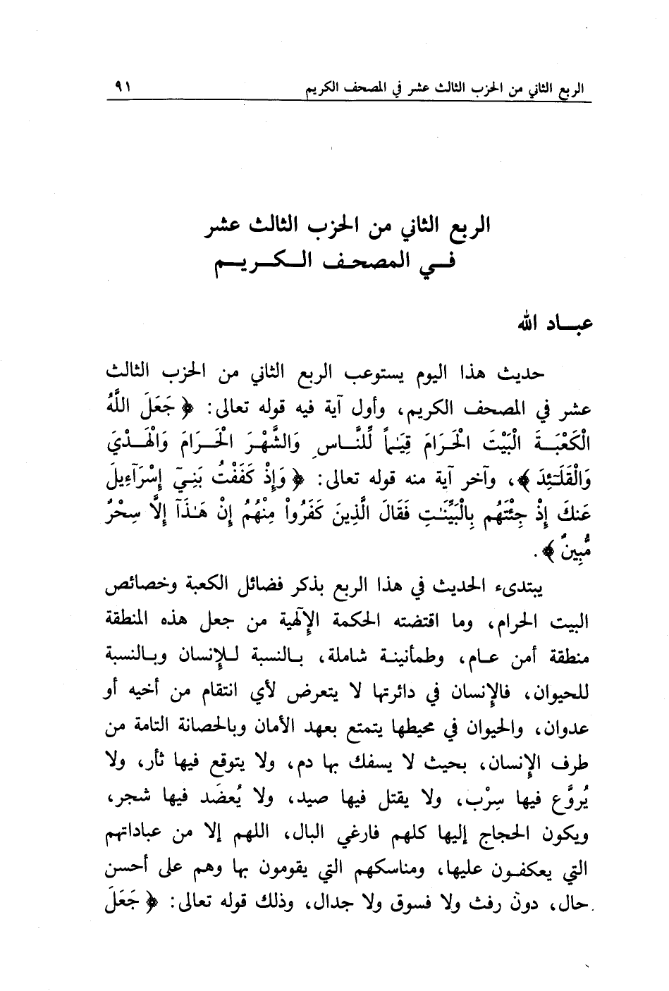 حديث هذا اليوم يستوب الربع الثاني من الحزب الثالث عشر في المصحف الكريم، وأول آية فيه قوله تعالى: {جَعَلَ اللَّهُ الْكَعْبَةَ الْبَيْتَ الْحَرَامَ قِيَامًا لِلنَّاسِ وَالشَّهْرَ الْحَرَامَ وَالْهَدْيَ وَالْقَلَائِدَ} وآخر آية منه قوله تعالى: {وَإِذْ كَفَفْتُ بَنِي إِسْرَائِيلَ عَنْكَ إِذْ جِئْتَهُمْ بِالْبَيِّنَاتِ فَقَالَ الَّذِينَ كَفَرُوا مِنْهُمْ إِنْ هَذَا إِلَّا سِحْرٌ مُبِينٌ}.