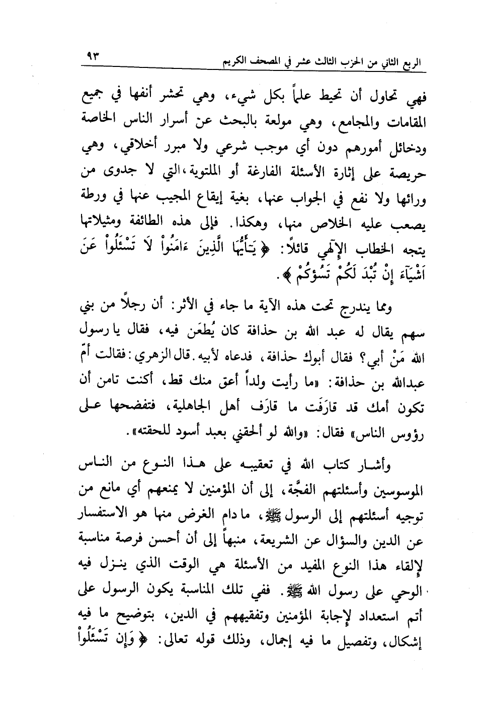 وأشار كتاب الله في تعقيبه على هذا النوع من الناس الموسوسين وأسئلتهم الفجة، إلى أن المؤمنين لا يمنعهم أي مانع من توجيه أسئلتهم إلى الرسول صلى الله عليه وسلم، ما دام الغرض منها هو الاستفسار عن الدين والسؤال عن الشريعة، منبها إلى أن أحسن فرصة مناسبة لإلقاء هذا النوع المفيد من الأسئلة هي الوقت الذي ينزل فيه الوحي على رسول الله صلى الله عليه وسلم، ففي تلك المناسبة يكون الرسول صلى الله عليه وسلم على أتم استعداد لإجابة المؤمنين وتفقيههم في الدين، بتوضيح ما فيه إشكال، وتفصيل ما فيه إجمال، وذلك قوله تعالى: {وَإِنْ تَسْأَلُوا
