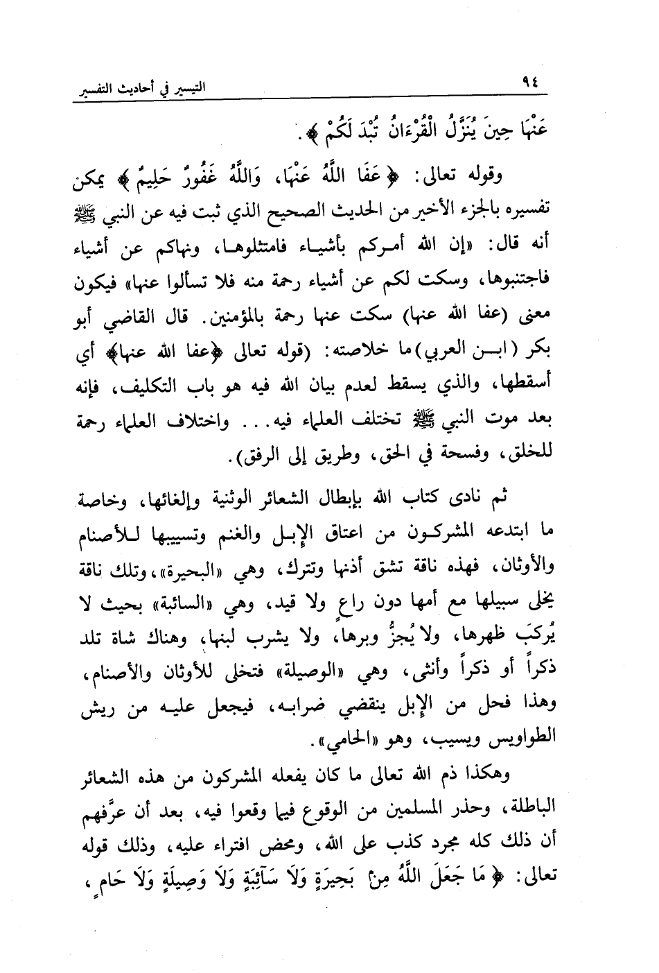 وقوله تعالى: {عَفَا اللَّهُ عَنْهَا وَاللَّهُ غَفُورٌ حَلِيمٌ} يمكن تفسيره بالجزء الأخير من الحديث الصحيح الذي ثبت فيه عن النبي صلى الله عليه وسلم أنه قال: (إن الله أمركم بأشياء فامتثلوها، ونهاكم عن أشياء فاجتنبوها، وسكت لكم عن أشياء رحمة منه فلا تسألوا عنها) فيكون معنى {عفا الله عنها} سكت عنها رحمة بالمؤمنين. قال القاضي أبو بكر (ابن العربي) ما خلاصته: قوله تعالى {عَفَا اللَّهُ عَنْهَا} أي أسقطها، والذي يسقط لعدم بيان الله فيه هو باب التكليف، فإنه بعد موت النبي صلى الله عليه وسلم تختلف العلماء فيه ... واختلاف العلماء رحمة للخلق، وفسحة في الحق، وطريق إلى الرفق).
