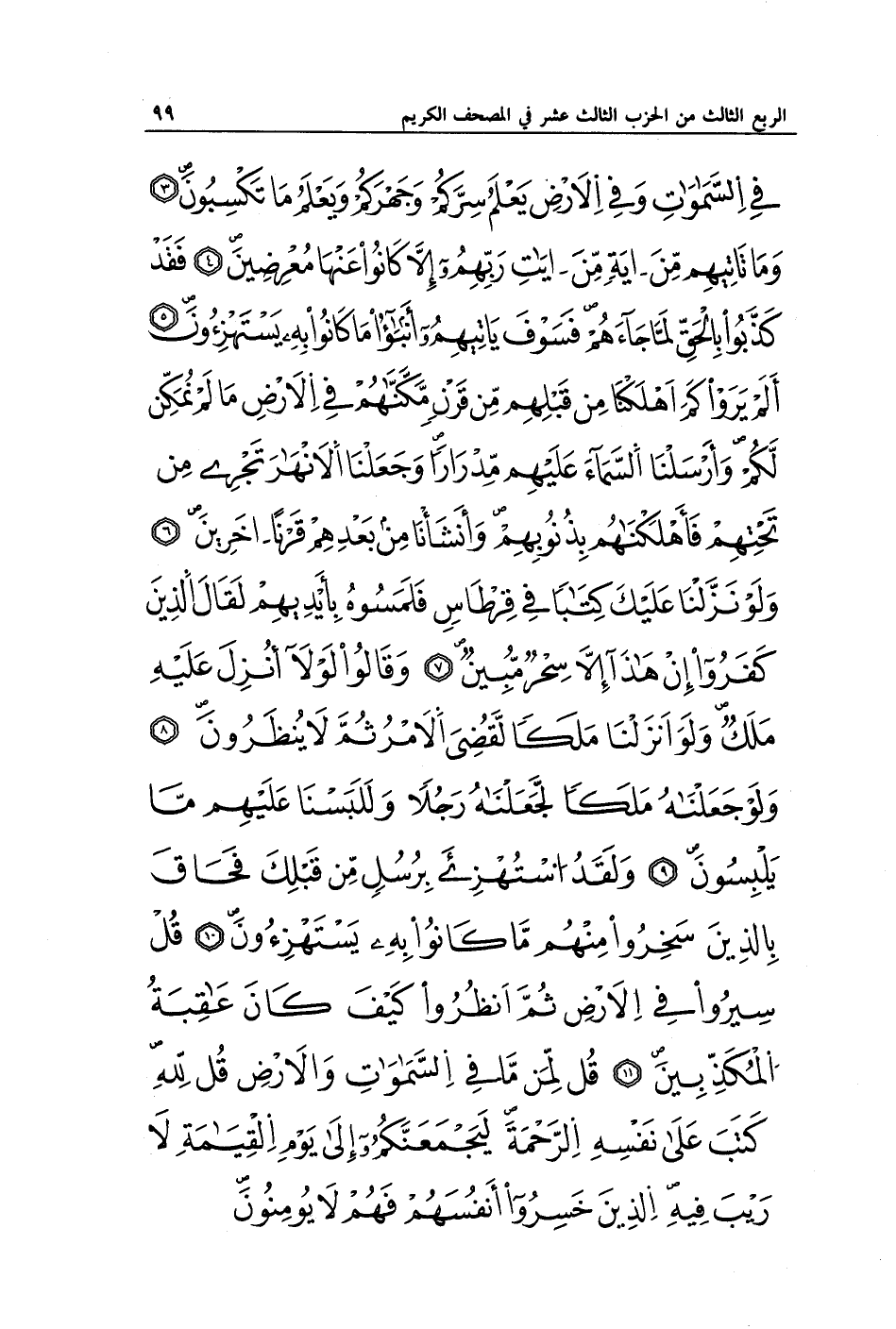 فِي السَّمَاوَاتِ وَفِي الْأَرْضِ يَعْلَمُ سِرَّكُمْ وَجَهْرَكُمْ وَيَعْلَمُ مَا تَكْسِبُونَ (3) وَمَا تَأْتِيهِمْ مِنْ آيَةٍ مِنْ آيَاتِ رَبِّهِمْ إِلَّا كَانُوا عَنْهَا مُعْرِضِينَ (4) فَقَدْ كَذَّبُوا بِالْحَقِّ لَمَّا جَاءَهُمْ فَسَوْفَ يَأْتِيهِمْ أَنْبَاءُ مَا كَانُوا بِهِ يَسْتَهْزِئُونَ (5) أَلَمْ يَرَوْا كَمْ أَهْلَكْنَا مِنْ قَبْلِهِمْ مِنْ قَرْنٍ مَكَّنَّاهُمْ فِي الْأَرْضِ مَا لَمْ نُمَكِّنْ لَكُمْ وَأَرْسَلْنَا السَّمَاءَ عَلَيْهِمْ مِدْرَارًا وَجَعَلْنَا الْأَنْهَارَ تَجْرِي مِنْ تَحْتِهِمْ فَأَهْلَكْنَاهُمْ بِذُنُوبِهِمْ وَأَنْشَأْنَا مِنْ بَعْدِهِمْ قَرْنًا آخَرِينَ (6) وَلَوْ نَزَّلْنَا عَلَيْكَ كِتَابًا فِي قِرْطَاسٍ فَلَمَسُوهُ بِأَيْدِيهِمْ لَقَالَ الَّذِينَ كَفَرُوا إِنْ هَذَا إِلَّا سِحْرٌ مُبِينٌ (7) وَقَالُوا لَوْلَا أُنْزِلَ عَلَيْهِ مَلَكٌ وَلَوْ أَنْزَلْنَا مَلَكًا لَقُضِيَ الْأَمْرُ ثُمَّ لَا يُنْظَرُونَ (8) وَلَوْ جَعَلْنَاهُ مَلَكًا لَجَعَلْنَاهُ رَجُلًا وَلَلَبَسْنَا عَلَيْهِمْ مَا يَلْبِسُونَ (9) وَلَقَدِ اسْتُهْزِئَ بِرُسُلٍ مِنْ قَبْلِكَ فَحَاقَ بِالَّذِينَ سَخِرُوا مِنْهُمْ مَا كَانُوا بِهِ يَسْتَهْزِئُونَ (10) قُلْ سِيرُوا فِي الْأَرْضِ ثُمَّ انْظُرُوا كَيْفَ كَانَ عَاقِبَةُ الْمُكَذِّبِينَ (11) قُلْ لِمَنْ مَا فِي السَّمَاوَاتِ وَالْأَرْضِ قُلْ لِلَّهِ كَتَبَ عَلَى نَفْسِهِ الرَّحْمَةَ لَيَجْمَعَنَّكُمْ إِلَى يَوْمِ الْقِيَامَةِ لَا رَيْبَ فِيهِ الَّذِينَ خَسِرُوا أَنْفُسَهُمْ فَهُمْ لَا يُؤْمِنُونَ (12)