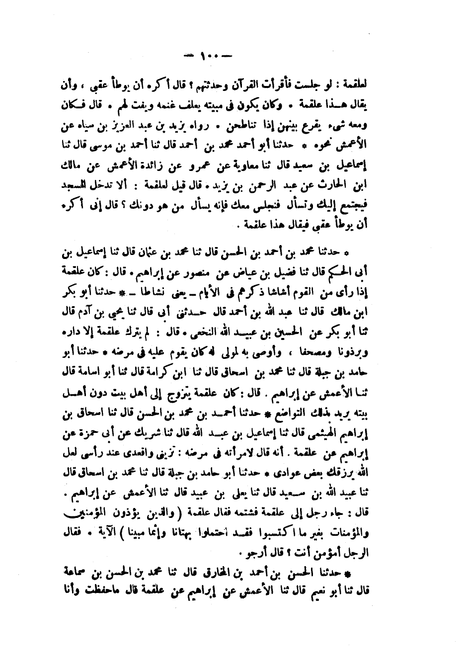 حَدَّثَنَا الْحَسَنُ بْنُ أَحْمَدَ بْنِ الْمُخَارِقِ، قَالَ: ثنا مُحَمَّدُ بْنُ الْحَسَنِ بْنِ سَمَاعَةَ، قَالَ: ثنا أَبُو نُعَيْمٍ، قَالَ: ثنا الْأَعْمَشُ، عَنْ إِبْرَاهِيمَ، عَنْ عَلْقَمَةَ، قَالَ: «§مَا حَفِظْتُ وَأَنَا -[101]- شَابٌّ كَأَنِّي أَنْظُرُ إِلَيْهِ فِي وَرَقَةٍ أَوْ قِرْطَاسٍ»