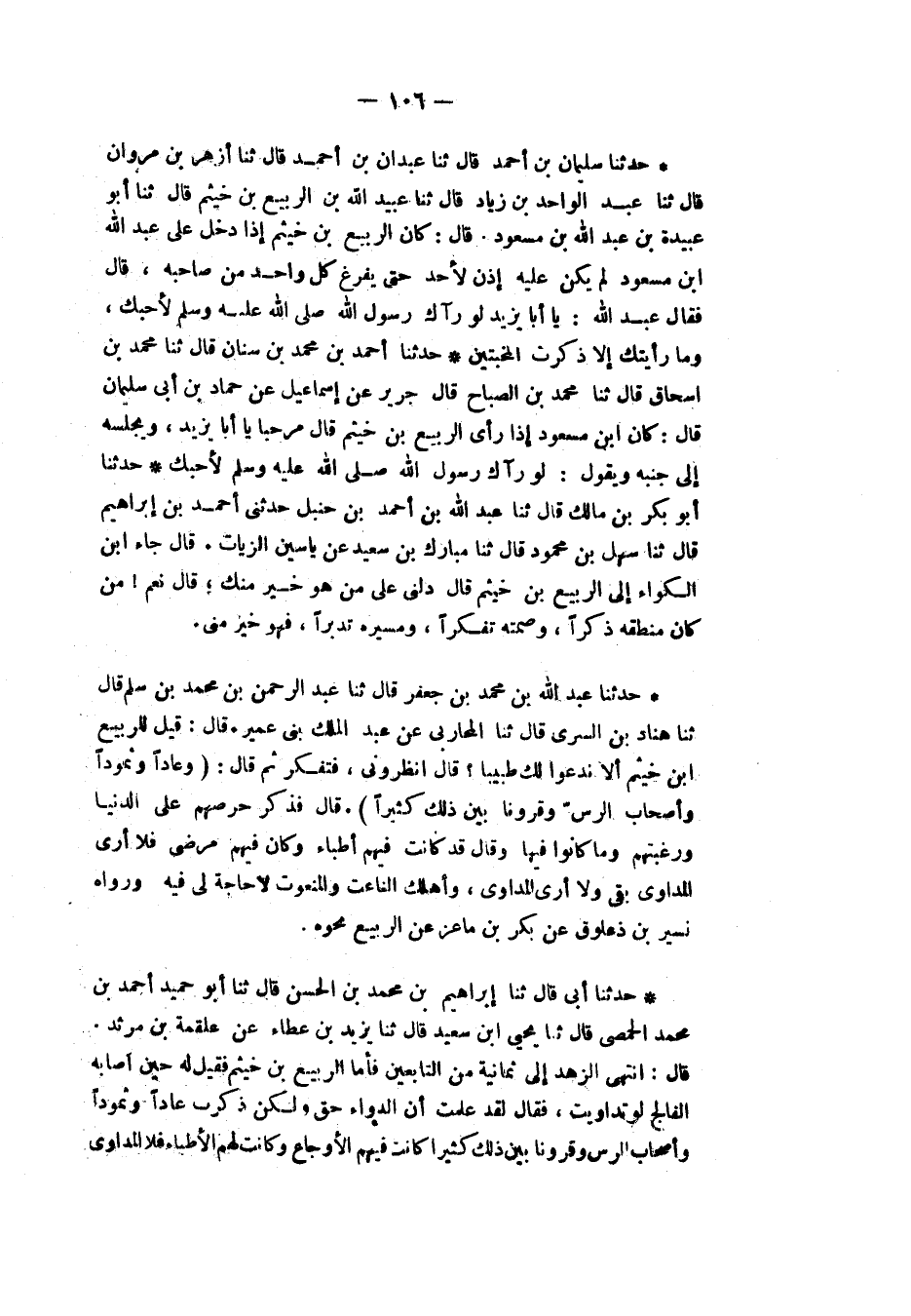 حَدَّثَنَا أَبِي قَالَ: ثنا إِبْرَاهِيمُ بْنُ مُحَمَّدِ بْنِ الْحَسَنِ، قَالَ: ثنا أَبُو حُمَيْدٍ أَحْمَدُ بْنُ مُحَمَّدٍ الْحِمْصِيُّ قَالَ: ثنا يَحْيَى بْنُ سَعِيدٍ، قَالَ: ثنا يَزِيدُ بْنُ عَطَاءٍ، عَنْ عَلْقَمَةَ بْنِ مَرْثَدٍ، قَالَ: " §انْتَهَى الزُّهْدُ إِلَى ثَمَانِيَةٍ مِنَ التَّابِعِينَ فَأَمَّا الرَّبِيعُ بْنُ خُثَيْمٍ فَقِيلَ لَهُ حِينَ أَصَابَهُ الْفَالِجُ: لَوْ تَدَاوَيْتَ فَقَالَ: لَقَدْ عَلِمْتُ أَنَّ الدَّوَاءَ حَقٌّ وَلَكِنْ ذَكَرْتُ عَادًا، وَثَمُودَ، وَأَصْحَابَ الرَّسِّ، وَقُرُونًا بَيْنَ ذَلِكَ كَثِيرًا كَانَتْ فِيهِمُ الْأَوْجَاعُ وَكَانَتْ لَهُمُ الْأَطِبَّاءُ فَلَا الْمُدَاوِي -[107]- بَقِيَ وَلَا الْمُدَاوَى فَقِيلَ لَهُ: أَلَا تَذْكُرُ النَّاسَ قَالَ: مَا أَنَا عَنْ نَفْسِي بِرَاضٍ فَأَتَفَرَّغُ مِنْ ذَمِّهَا إِلَى ذَمِّ النَّاسِ، إِنَّ النَّاسَ خَافُوا اللهَ تَعَالَى فِي ذُنُوبِ النَّاسِ وَأَمِنُوا عَلَى ذُنُوبِهِمْ وَقِيلَ لَهُ: كَيْفَ أَصْبَحْتَ؟ قَالَ: أَصْبَحْنَا مُذْنِبِينَ نَأْكُلُ أَرْزَاقَنَا وَنَنْتَظِرُ آجَالَنَا "