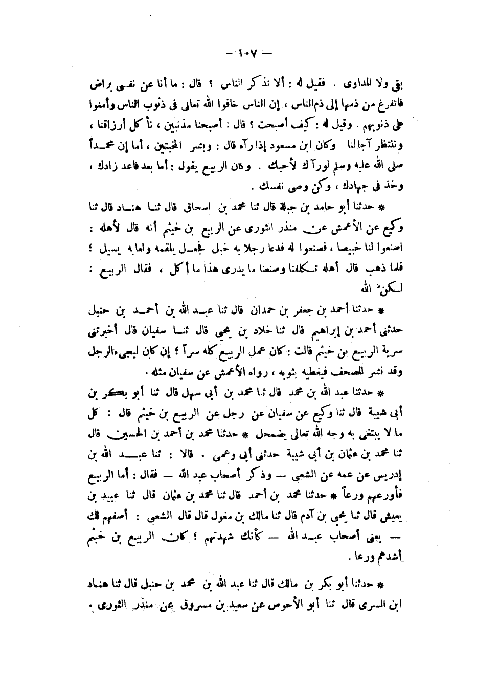 حَدَّثَنَا أَحْمَدُ بْنُ جَعْفَرِ بْنِ حَمْدَانَ، قَالَ: ثنا عَبْدُ اللهِ بْنُ أَحْمَدَ بْنِ حَنْبَلٍ، حَدَّثَنِي أَحْمَدُ بْنُ إِبْرَاهِيمَ، قَالَ: ثنا خَلَّادُ بْنُ يَحْيَى، قَالَ: ثنا سُفْيَانُ، قَالَ: أَخْبَرَتْنِي سُرِّيَّةُ الرَّبِيعِ بْنِ خُثَيْمٍ، قَالَتْ: «§كَانَ عَمَلُ الرَّبِيعِ كُلُّهُ سِرًّا إِنْ كَانَ لَيَجِيءُ الرَّجُلُ وَقَدْ نَشَرَ الْمُصْحَفَ فَيُغَطِّيهِ بِثَوْبِهِ» رَوَاهُ الْأَعْمَشُ، عَنْ سُفْيَانَ مِثْلَهُ