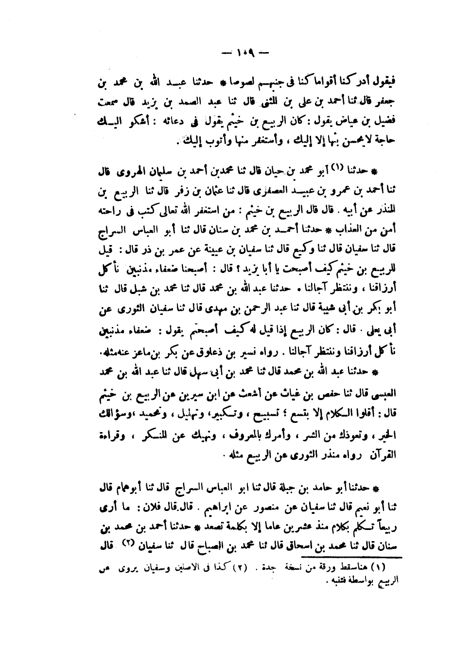 حَدَّثَنَا أَحْمَدُ بْنُ مُحَمَّدِ بْنِ سِنَانَ، قَالَ: ثنا مُحَمَّدُ بْنُ إِسْحَاقَ، قَالَ: ثنا مُحَمَّدُ بْنُ الصَّبَّاحِ، قَالَ: ثنا سُفْيَانُ، -[110]- قَالَ: صَحِبْنَا الرَّبِيعَ بْنَ خُثَيْمٍ عِشْرِينَ سَنَةً «§فَمَا تَكَلَّمَ إِلَّا بِكَلِمَةٍ تَصْعَدُ» وَقَالَ آخَرُ «صَحِبْتُهُ سَنَتَيْنِ فَمَا كَلَّمَنِي إِلَّا كَلِمَتَيْنِ»