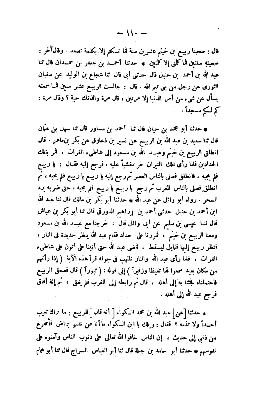حَدَّثَنَا أَبُو مُحَمَّدِ بْنُ حَيَّانَ، قَالَ: ثنا أَحْمَدُ بْنُ مُسَاوِرٍ، قَالَ: ثنا سَهْلُ بْنُ عُثْمَانَ، قَالَ: ثنا سَعِيدُ بْنُ عَبْدِ اللهِ بْنِ الرَّبِيعِ، عَنْ نُسَيْرِ بْنِ ذُعْلُوقٍ، عَنْ بَكْرِ بْنِ مَاعِزٍ، قَالَ: انْطَلَقَ الرَّبِيعُ بْنُ خُثَيْمٍ وَعَبْدُ اللهِ بْنُ مَسْعُودٍ إِلَى شَاطِئِ الْفُرَاتِ فَمَرَّ بِتِلْكَ الْحَدَّادِينَ §فَلَمَّا رَأَى تِلْكَ النِّيرَانَ خَرَّ مَغْشِيًّا عَلَيْهِ فَرَجَعَ إِلَيْهِ فَقَالَ: «يَا رَبِيعُ» فَلَمْ يُجِبْهُ فَانْطَلَقَ فَصَلَّى بِالنَّاسِ الْعَصْرَ ثُمَّ رَجَعَ إِلَيْهِ فَقَالَ: «يَا رَبِيعُ يَا رَبِيعُ» فَلَمْ يُجِبْهُ ثُمَّ انْطَلَقَ فَصَلَّى بِالنَّاسِ الْمَغْرِبَ ثُمَّ رَجَعَ فَقَالَ: «يَا رَبِيعُ يَا رَبِيعُ» فَلَمْ يُجِبْهُ حَتَّى ضَرَبَهُ بَرْدُ السَّحَرِ رَوَاهُ أَبُو وَائِلٍ، عَنْ عَبْدِ اللهِ