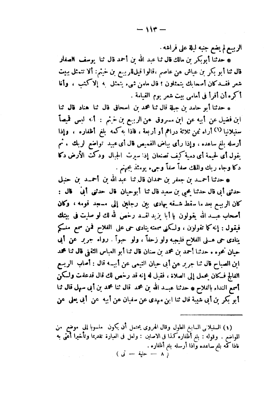 حَدَّثَنَا أَبُو بَكْرِ بْنُ مَالِكٍ، قَالَ: ثنا عَبْدُ اللهِ بْنُ أَحْمَدَ، قَالَ: ثنا يُوسُفُ الصَّفَّارُ، قَالَ: ثنا أَبُو بَكْرِ بْنُ عَيَّاشٍ، عَنْ عَاصِمٍ، قَالَ: قِيلَ لِلرَّبِيعِ بْنِ خُثَيْمٍ: أَلَا تَتَمَثَّلُ بِبَيْتِ شِعْرٍ فَقَدْ كَانَ أَصْحَابُكَ يَتَمَثَّلُونَ؟ قَالَ: «§مَا مِنْ شَيْءٍ يُتَمَثَّلُ بِهِ إِلَّا كُتِبَ وَأَنَا أَكْرَهُ أَنْ أَقْرَأَ فِي أَمَامِي بَيْتَ شِعْرٍ يَوْمَ الْقِيَامَةِ»