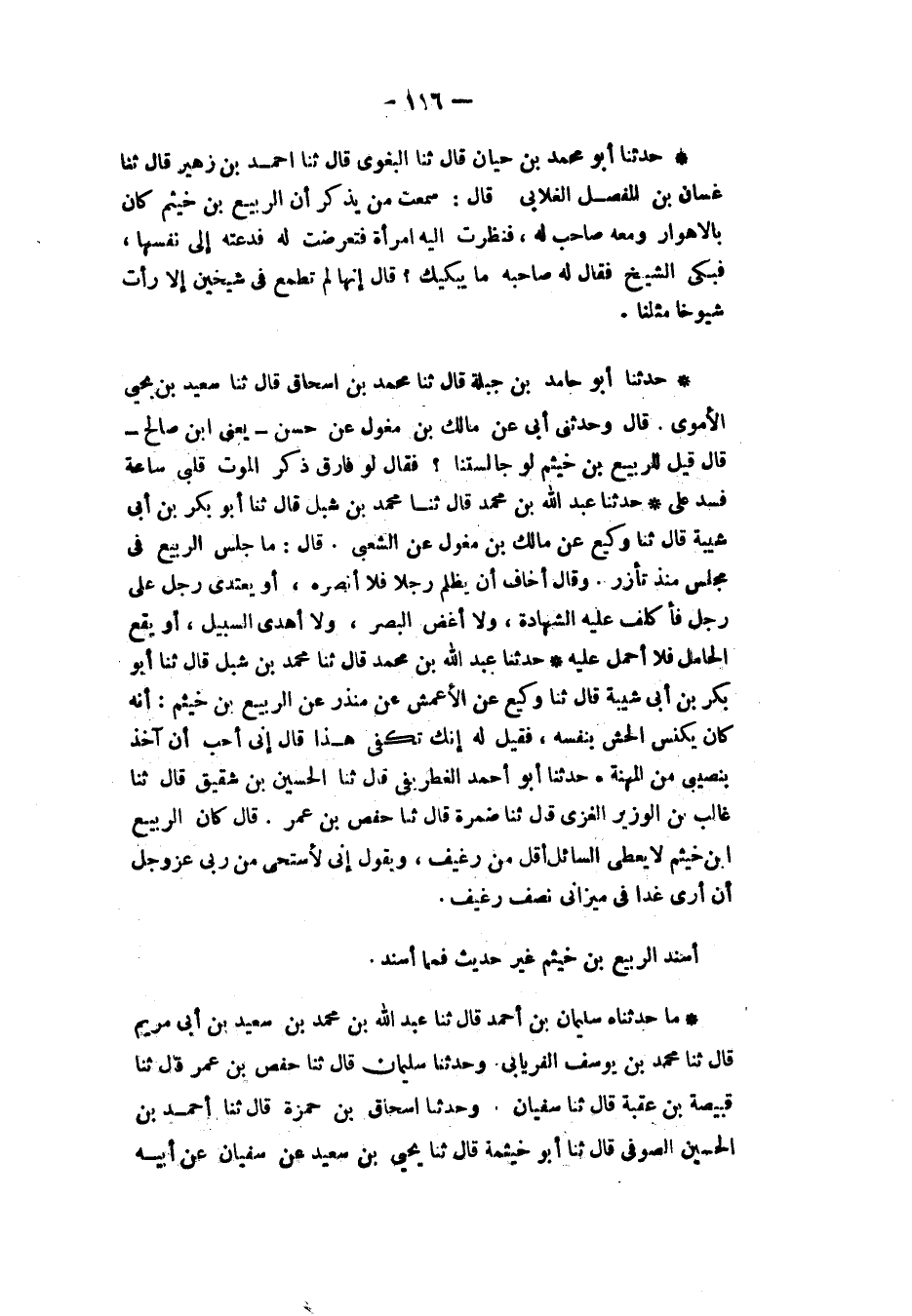 حَدَّثَنَا عَبْدُ اللهِ بْنُ مُحَمَّدٍ، قَالَ: ثنا مُحَمَّدُ بْنُ شِبْلٍ، قَالَ: ثنا أَبُو بَكْرِ بْنُ أَبِي شَيْبَةَ، قَالَ: ثنا وَكِيعٌ، عَنْ مَالِكِ بْنِ مِغْوَلٍ، عَنِ الشَّعْبِيِّ، قَالَ: مَا جَلَسَ الرَّبِيعُ فِي مَجْلِسٍ مُنْذُ تَأَزَّرَ وَقَالَ: «§أَخَافُ أَنْ يُظْلَمَ رَجُلٌ فَلَا أَنْصُرَهُ أَوْ يَعْتَدِيَ رَجُلٌ عَلَى رَجُلٍ فَأُكَلَّفَ عَلَيْهِ الشَّهَادَةَ وَلَا أَغُضَّ الْبَصَرَ وَلَا أَهْدِيَ السَّبِيلَ أَوْ يَقَعَ الْحَامِلُ فَلَا أَحْمِلَ عَلَيْهِ»