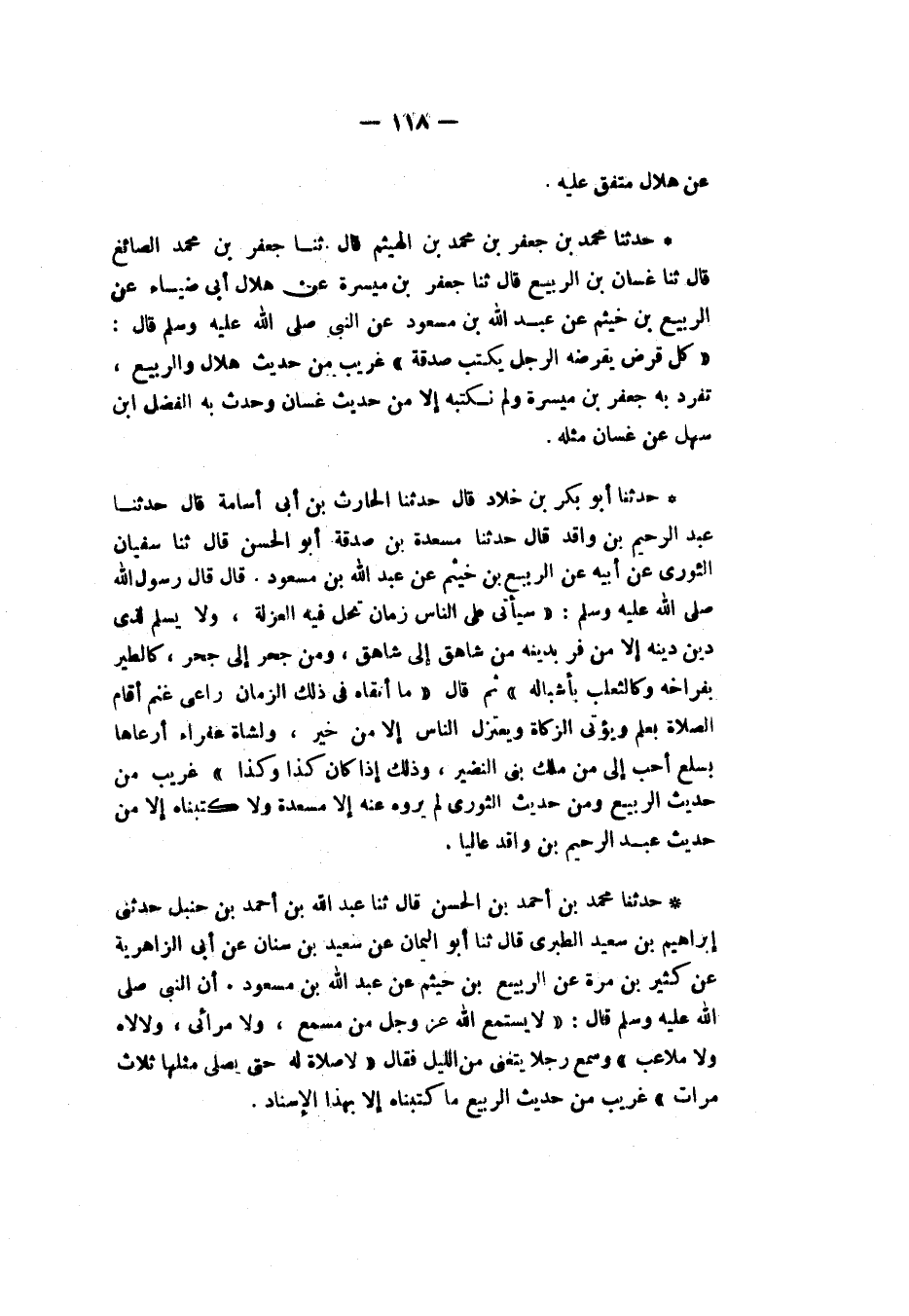 حَدَّثَنَا أَبُو بَكْرِ بْنُ خَلَّادٍ، قَالَ: حَدَّثَنَا الْحَارِثُ بْنُ أَبِي أُسَامَةَ، قَالَ: حَدَّثَنَا عَبْدُ الرَّحِيمِ بْنُ وَاقِدٍ، قَالَ: حَدَّثَنَا مَسْعَدَةُ بْنُ صَدَقَةَ أَبُو الْحَسَنِ، قَالَ: ثنا سُفْيَانُ الثَّوْرِيُّ، عَنْ أَبِيهِ، عَنِ الرَّبِيعِ بْنِ خُثَيْمٍ، عَنْ عَبْدِ اللهِ بْنِ مَسْعُودٍ، قَالَ: قَالَ رَسُولُ اللهِ صَلَّى اللهُ عَلَيْهِ وَسَلَّمَ: «§سَيَأْتِي عَلَى النَّاسِ زَمَانٌ تَحِلُّ فِيهِ الْعُزْلَةُ وَلَا يَسْلَمُ لِذِي دِينٍ دِينُهُ إِلَّا مَنْ فَرَّ بِدِينِهِ مِنْ شَاهِقٍ إِلَى شَاهِقٍ وَمِنْ جُحْرٍ إِلَى جُحْرٍ كَالطَّيْرِ بِفِرَاخِهِ وَكَالثَّعْلَبِ بِأَشْبَالِهِ» ثُمَّ قَالَ: «مَا أَتْقَاهُ فِي ذَلِكَ الزَّمَانِ رَاعِيَ غَنْمٍ أَقَامَ الصَّلَاةَ بِعِلْمٍ وَيُؤْتِي الزَّكَاةَ وَيَعْتَزِلُ النَّاسَ إِلَّا مِنْ خَيْرٍ، وَلَشَاةٌ عَفْرَاءُ أَرْعَاهَا بِسَلْعٍ أَحَبُّ إِلَيَّ مِنْ مُلْكِ بَنِي النَّضِيرِ وَذَلِكَ إِذَا كَانَ كَذَا وَكَذَا» غَرِيبٌ مِنْ حَدِيثِ الرَّبِيعِ وَمِنْ حَدِيثِ الثَّوْرِيِّ لَمْ يَرْوِهِ عَنْهُ إِلَّا مَسْعَدَةُ وَلَا كَتَبْنَاهُ إِلَّا مِنْ حَدِيثِ عَبْدِ الرَّحِيمِ بْنِ وَاقِدٍ عَالِيًا