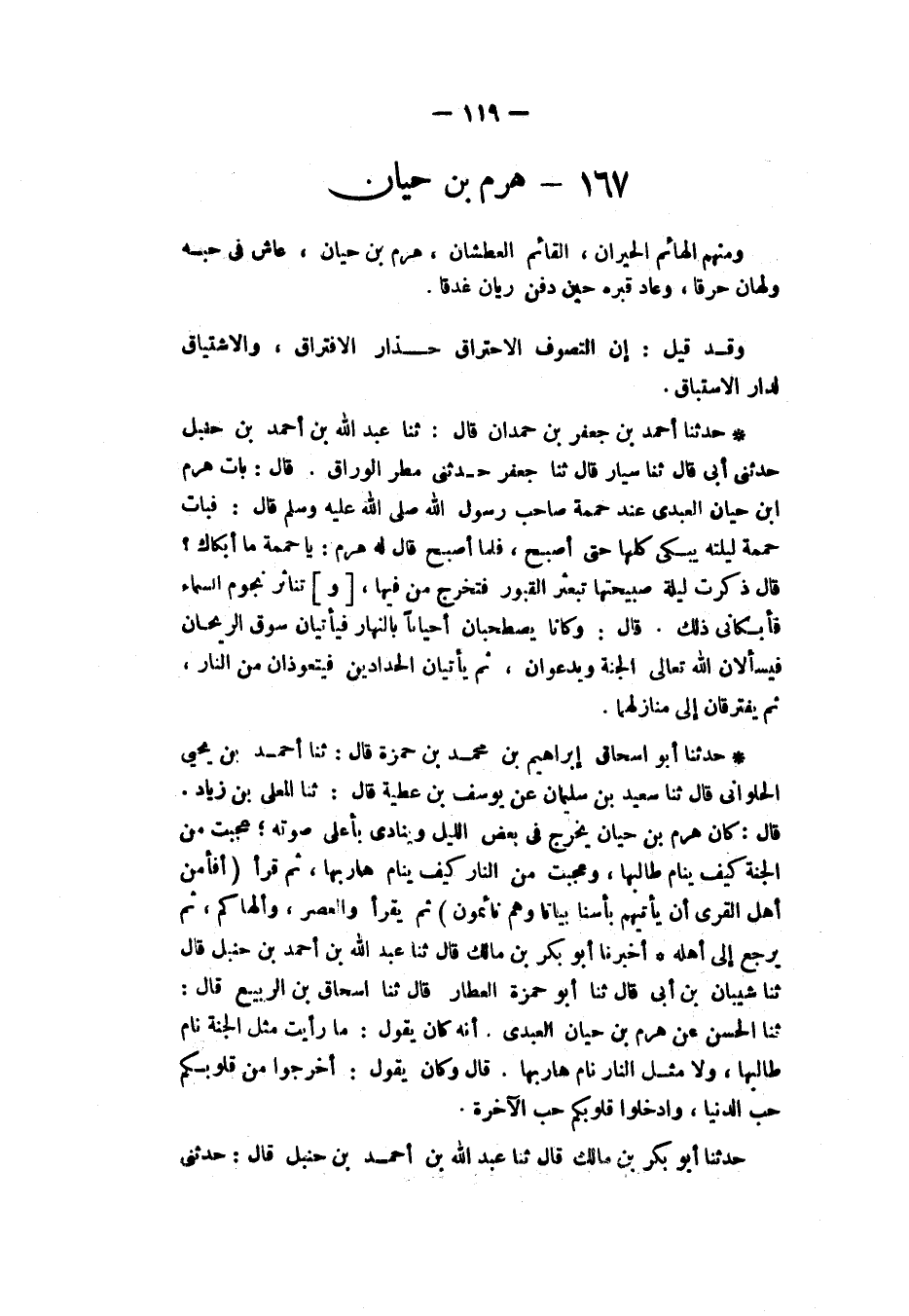 حَدَّثَنَا أَحْمَدُ بْنُ جَعْفَرِ بْنِ حَمْدَانَ، قَالَ: ثنا عَبْدُ اللهِ بْنُ أَحْمَدَ بْنِ حَنْبَلٍ، حَدَّثَنِي أَبِي قَالَ: ثنا سَيَّارٌ قال: ثنا جَعْفَرٌ، حَدَّثَنِي مَطَرٌ الْوَرَّاقُ، قَالَ: بَاتَ هَرِمُ بْنُ حَيَّانَ الْعَبْدِيُّ عِنْدَ حُمَمَةَ صَاحِبِ رَسُولِ اللهِ صَلَّى اللهُ عَلَيْهِ وَسَلَّمَ قَالَ: فَبَاتَ حُمَمَةُ لَيْلَتَهُ يَبْكِي كُلَّهَا حَتَّى أَصْبَحَ فَلَمَّا أَصْبَحَ قَالَ لَهُ هَرِمٌ: يَا حُمَمَةُ مَا أَبْكَاكَ؟ قَالَ: «§ذَكَرْتُ لَيْلَةً صَبِيحَتُهَا تُبَعْثَرُ الْقُبُورُ فَتُخْرِجُ مَنْ فِيهَا وَتَتَنَاثَرُ نُجُومُ السَّمَاءِ فَأَبْكَانِي ذَلِكَ» قَالَ: وَكَانَا يَصْطَحِبَانِ أَحْيَانًا بِالنَّهَارِ فَيَأْتِيَانِ سُوقَ الرَّيْحَانِ فَيَسْأَلَانِ اللهَ تَعَالَى الْجَنَّةَ وَيَدْعُوانِ ثُمَّ يَأْتِيَانِ الْحَدَّادِينَ فَيَتَعَوَّذَانِ مِنَ النَّارِ ثُمَّ يَفْتَرِقَانِ إِلَى مَنَازِلِهِمَا