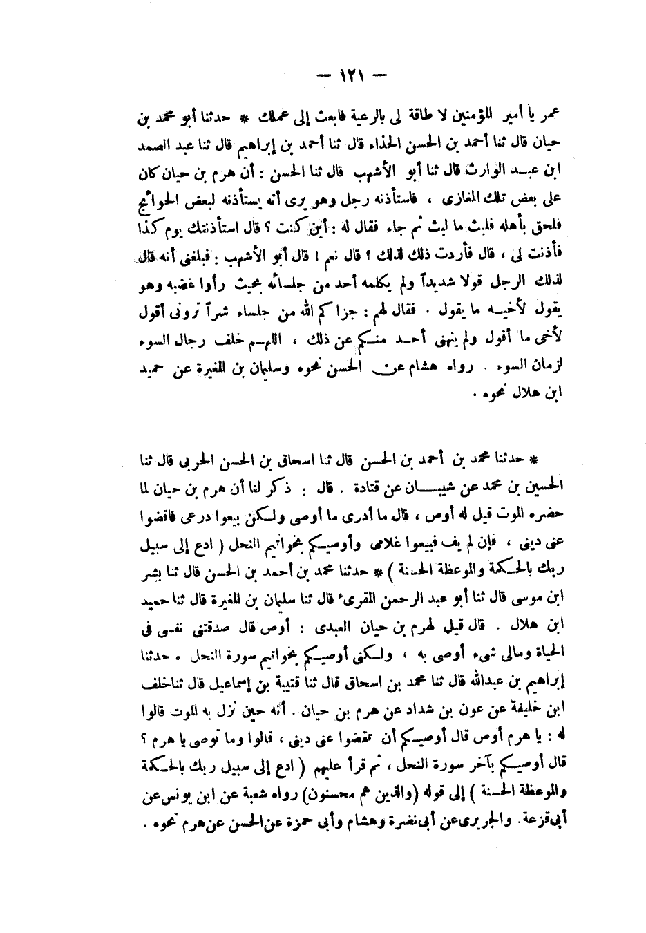حَدَّثَنَا مُحَمَّدُ بْنُ أَحْمَدَ بْنِ الْحَسَنِ، قَالَ: ثنا بِشْرُ بْنُ مُوسَى، قَالَ: ثنا أَبُو عَبْدِ الرَّحْمَنِ الْمُقْرِئُ، قَالَ: ثنا سُلَيْمَانُ بْنُ الْمُغِيرَةِ، قَالَ: ثنا حُمَيْدُ بْنُ هِلَالٍ، قَالَ: قِيلَ لِهَرِمِ بْنِ حَيَّانَ الْعَبْدِيِّ: أَوْصِ قَالَ: «§صَدَّقَتْنِي نَفْسِي فِي الْحَيَاةِ وَمَا لِي شَيْءٌ أُوصِي بِهِ وَلَكِنِّي أُوصِيكُمْ بِخَوَاتِيمِ سُورَةِ النَّحْلِ»