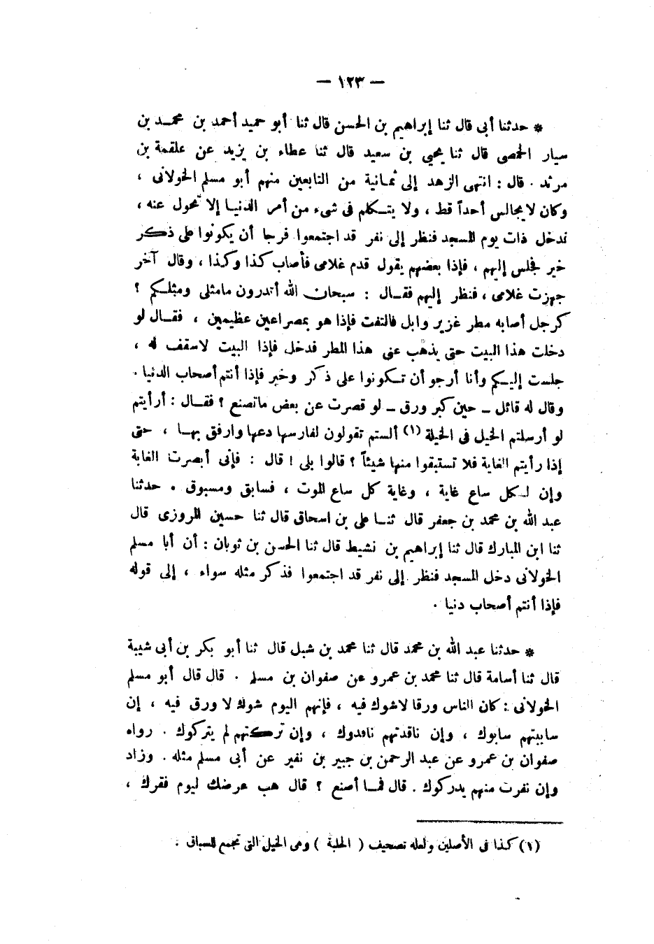 حَدَّثَنَا أَبِي قَالَ: ثنا إِبْرَاهِيمُ بْنُ الْحَسَنِ، قَالَ: ثنا أَبُو حُمَيْدِ أَحْمَدُ بْنُ مُحَمَّدِ بْنِ سَيَّارٍ الْحِمْصِيُّ، قَالَ: ثنا يَحْيَى بْنُ سَعِيدٍ، قَالَ: ثنا عَطَاءُ بْنُ يَزِيدَ، عَنْ عَلْقَمَةَ بْنِ مَرْثَدٍ، قَالَ: " §انْتَهَى الزُّهْدُ إِلَى ثَمَانِيَةٍ مِنَ التَّابِعِينَ مِنْهُمْ أَبُو مُسْلِمٍ الْخَوْلَانِيُّ وَكَانَ لَا يُجَالِسُ أَحَدًا قَطُّ، وَلَا يُتَكَلَّمُ فِي شَيْءٍ مِنْ أَمْرِ الدُّنْيَا إِلَّا تَحَوَّلَ عَنْهُ فَدَخَلَ ذَاتَ يَوْمٍ الْمَسْجِدَ فَنَظَرَ إِلَى نَفَرٍ قَدِ اجْتَمَعُوا فَرَجَا أَنْ يَكُونُوا عَلَى ذِكْرِ خَيْرٍ فَجَلَسَ إِلَيْهِمْ فَإِذَا بَعْضُهُمْ يَقُولُ: قَدِمَ غُلَامِي فَأَصَابَ كَذَا وَكَذَا وَقَالَ آخَرُ: جَهَّزْتُ غُلَامِي فَنَظَرَ إِلَيْهِمْ فَقَالَ: سُبْحَانَ اللهِ أَتَدْرُونَ مَا مَثَلِي وَمَثَلُكُمْ كَرَجُلٍ أَصَابَهُ مَطَرٌ غَزِيرٌ وَابِلٌ فَالْتَفَتَ فَإِذَا هُوَ بِمِصْرَاعَيْنِ عَظِيمَيْنِ فَقَالَ: لَوْ دَخَلْتُ هَذَا الْبَيْتَ حَتَّى يَذْهَبَ عَنِّي هَذَا الْمَطَرُ فَدَخَلَ فَإِذَا الْبَيْتُ لَا سَقْفَ لَهُ، جَلَسْتُ إِلَيْكُمْ وَأَنَا أَرْجُو أَنْ تَكُونُوا عَلَى ذِكْرٍ وَخَيْرٍ فَإِذَا أَنْتُمْ أَصْحَابُ الدُّنْيَا وَقَالَ لَهُ قَائِلٌ حِينَ كَبُرَ وَرَقَّ: لَوْ قَصُرْتَ عَنْ بَعْضِ مَا تَصْنَعُ فَقَالَ: أَرَأَيْتُمْ لَوْ أَرْسَلْتُمُ الْخَيْلَ فِي الْحَلَبَةِ أَلَسْتُمْ تَقُولُونَ لِفَارِسِهَا دَعْهَا وَارْفُقْ بِهَا حَتَّى إِذَا رَأَيْتُمُ الْغَايَةَ فَلَا تَسْتَبِقُوا مِنْهَا شَيْئًا؟ قَالُوا: بَلَى، قَالَ: فَإِنِّي أَبْصَرْتُ الْغَايَةَ وَإِنَّ لِكُلِّ سَاعٍ غَايَةً وَغَايَةُ كُلِّ سَاعٍ الْمَوْتُ فَسَابِقٌ وَمَسْبُوقٌ " حَدَّثَنَا عَبْدُ اللهِ بْنُ مُحَمَّدِ بْنِ جَعْفَرٍ، قَالَ: ثنا عَلِيُّ بْنُ إِسْحَاقَ، قَالَ: ثنا حُسَيْنٌ الْمَرْوَزِيُّ، قَالَ: ثنا ابْنُ الْمُبَارَكِ، قَالَ: ثنا إِبْرَاهِيمُ بْنُ نَشِيطٍ، قَالَ: ثنا الْحَسَنُ بْنُ ثَوْبَانَ: أَنَّ أَبَا مُسْلِمٍ الْخَوْلَانِيَّ، دَخَلَ الْمَسْجِدَ فَنَظَرَ إِلَى نَفَرٍ قَدِ اجْتَمَعُوا فَذَكَرَ مِثْلَهُ سَوَاءً إِلَى قَوْلِهِ: فَإِذَا أَنْتُمْ أَصْحَابُ دُنْيَا