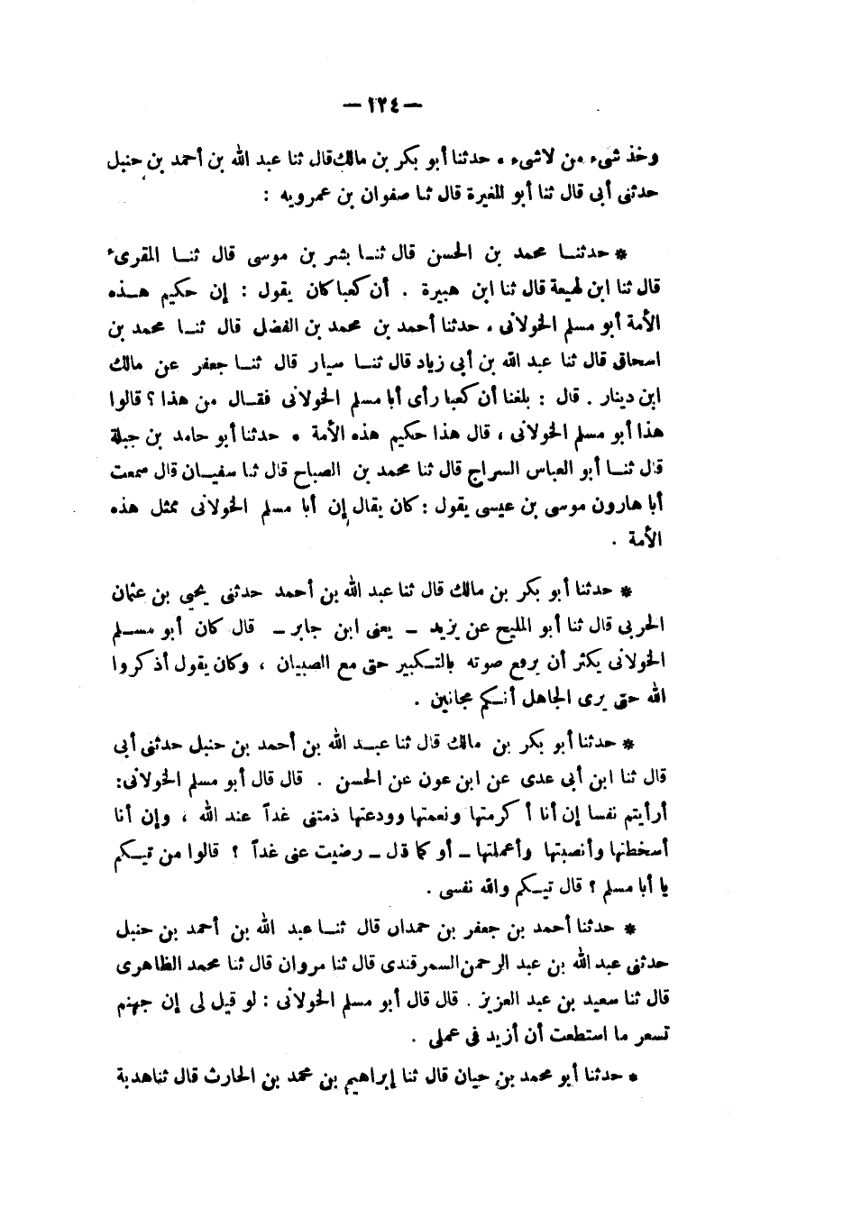 حَدَّثَنَا أَبُو بَكْرِ بْنُ مَالِكٍ، قَالَ: ثنا عَبْدُ اللهِ بْنُ أَحْمَدَ بْنِ حَنْبَلٍ، حَدَّثَنِي أَبِي قَالَ: ثنا ابْنُ أَبِي عَدِيٍّ، عَنِ ابْنِ عَوْنٍ، عَنِ الْحَسَنِ، قَالَ: قَالَ أَبُو مُسْلِمٍ الْخَوْلَانِيُّ: «§أَرَأَيْتُمْ نَفْسًا إِنْ أَنَا أَكْرَمْتُهَا، وَنَعَّمْتُهَا، وَوَدَعْتُهَا، ذَمَّتْنِي غَدًا عِنْدَ اللهِ وَإِنْ أَنَا أَسْخَطْتُهَا وَأَنْصَبْتُهَا وَأَعْمَلْتُهَا» أَوْ كَمَا قَالَ «رَضِيَتْ عَنِّي غَدًا» قَالُوا: مَنْ تِيكُمْ يَا أَبَا مُسْلِمٍ؟ قَالَ: «تِيكُمْ وَاللهِ نَفْسِي»