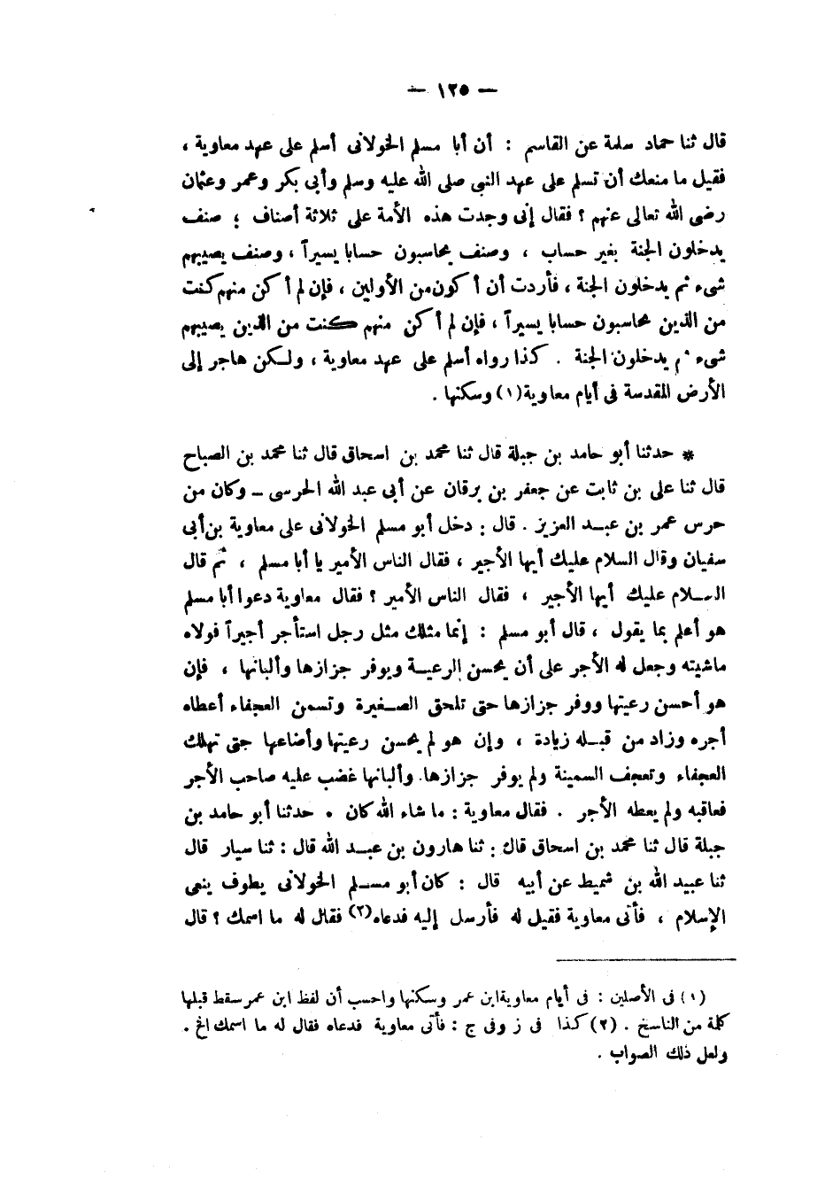 حَدَّثَنَا أَبُو حَامِدِ بْنُ جَبَلَةَ، قَالَ: ثنا مُحَمَّدُ بْنُ إِسْحَاقَ، قَالَ: ثنا مُحَمَّدُ بْنُ الصَّبَّاحِ، قَالَ: ثنا عَلِيُّ بْنُ ثَابِتٍ، عَنْ جَعْفَرِ بْنِ بُرْقَانَ، عَنْ أَبِي عَبْدِ اللهِ الْحَرَسَيِّ، وَكَانَ مِنْ حَرَسِ عُمَرَ بْنِ عَبْدِ الْعَزِيزِ قَالَ: دَخَلَ أَبُو مُسْلِمٍ الْخَوْلَانِيُّ عَلَى مُعَاوِيَةَ بْنِ أَبِي سُفْيَانَ وَقَالَ: «السَّلَامُ عَلَيْكَ أَيُّهَا الْأَجِيرُ» فَقَالَ النَّاسُ الْأَمِيرُ يَا أَبَا مُسْلِمٍ ثُمَّ قَالَ: «السَّلَامُ عَلَيْكَ أَيُّهَا الْأَجِيرُ» فَقَالَ النَّاسُ: الْأَمِيرُ فَقَالَ مُعَاوِيَةُ: دَعُوا أَبَا مُسْلِمٍ هُوَ أَعْلَمُ بِمَا يَقُولُ قَالَ أَبُو مُسْلِمٍ: «§إِنَّمَا مَثَلُكَ مَثَلُ رَجُلٍ اسْتَأْجَرَ أَجِيرًا فَوَلَّاهُ مَاشِيَتَهُ وَجَعَلَ لَهُ الْأَجْرَ عَلَى أَنْ يُحْسِنَ الرَّعِيَّةَ وَيُوَفِّرَ جَزَازَهَا وَأَلْبَانَهَا فَإِنْ هُوَ أَحْسَنَ رَعِيَّتَهَا وَوَفَّرَ جَزَازَهَا حَتَّى تَلْحَقَ الصَّغِيرَةُ وَتَسْمَنَ الْعَجْفَاءُ أَعْطَاهُ أَجْرَهُ وَزَادَهُ مِنْ قِبَلِهِ زِيَادَةً وَإِنْ هُوَ لَمْ يُحْسِنْ رَعِيَّتَهَا وَأَضَاعَهَا حَتَّى تَهْلَكَ الْعَجْفَاءُ وَتَعْجَفَ السَّمِينَةُ وَلَمْ يُوَفِّرْ جَزَازَهَا وَأَلْبَانَهَا غَضِبَ عَلَيْهِ صَاحِبُ الْأَجْرِ فَعَاقَبَهُ وَلَمْ يُعْطِهِ الْأَجْرَ» فَقَالَ مُعَاوِيَةُ: مَا شَاءَ اللهُ كَانَ