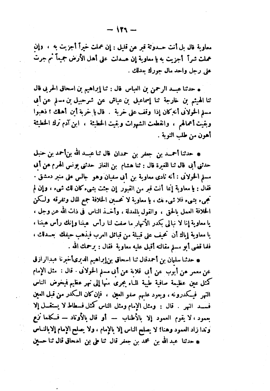 حَدَّثَنَا أَحْمَدُ بْنُ جَعْفَرِ بْنِ حَمْدَانَ، قَالَ: ثنا عَبْدُ اللهِ بْنُ أَحْمَدَ بْنِ حَنْبَلٍ، حَدَّثَنِي أَبِي قَالَ: ثنا الْمُغِيرَةُ، قَالَ: ثنا هِشَامُ بْنُ الْغَازِ، حَدَّثَنِي يُونُسُ بْنُ الْهَرَمِ، عَنْ أَبِي مُسْلِمٍ الْخَوْلَانِيِّ: أَنَّهُ نَادَى مُعَاوِيَةَ بْنَ أَبِي سُفْيَانَ وَهُوَ جَالِسٌ عَلَى مِنْبَرِ دِمَشْقَ فَقَالَ: «يَا مُعَاوِيَةُ §إِنَّمَا أَنْتَ قَبْرٌ مِنَ الْقُبُورِ إِنْ جِئْتَ بِشَيْءٍ كَانَ لَكَ شَيْءٌ وَإِنْ لَمْ تَجِئْ بِشَيْءٍ فَلَا شَيْءَ لَكَ، يَا مُعَاوِيَةُ لَا تَحْسَبَنَّ الْخِلَافَةَ جَمْعَ الْمَالِ وَتَفَرُّقَهُ وَلَكِنَّ الْخِلَافَةَ الْعَمَلُ بِالْحَقِّ وَالْقَوْلُ بِالْمَعْدَلَةِ وَأَخْذُ النَّاسِ فِي ذَاتِ اللهِ عَزَّ وَجَلَّ يَا مُعَاوِيَةُ إِنَّا لَا نُبَالِي بِكَدَرِ الْأَنْهَارِ مَا صَفَتْ لَنَا رَأْسُ عَيْنِنَا وَإِنَّكَ رَأْسُ عَيْنِنَا، يَا مُعَاوِيَةُ إِيَّاكَ أَنْ تَحِيفَ عَلَى قَبِيلَةٍ مِنْ قَبَائِلِ الْعَرَبِ فَيَذْهَبَ حَيْفُكَ بِعَدْلِكَ» فَلَمَّا قَضَى أَبُو مُسْلِمٍ مَقَالَتَهُ أَقْبَلَ عَلَيْهِ مُعَاوِيَةُ فَقَالَ: يَرْحَمُكَ اللهُ "