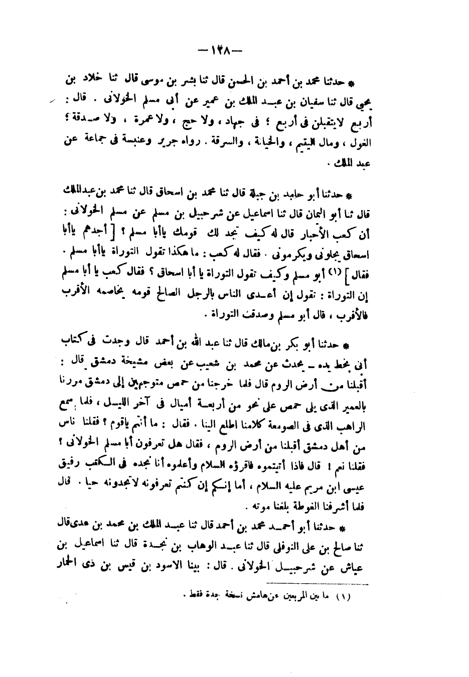 حَدَّثَنَا أَبُو بَكْرِ بْنُ مَالِكٍ، قَالَ: ثنا عَبْدُ اللهِ بْنُ أَحْمَدَ، قَالَ: وَجَدْتُ فِي كِتَابِ أَبِي بِخَطِّ يَدِهِ يحَدِّثُ عَنْ مُحَمَّدِ بْنِ شُعَيْبٍ، عَنْ بَعْضِ مَشْيَخَةِ دِمَشْقَ قَالَ: " أَقْبَلْنَا مِنْ أَرْضِ الرُّومِ قَالَ: فَلَمَّا خَرَجْنَا مِنْ حِمْصَ مُتَوَجِّهِينَ إِلَى دِمَشْقَ مَرَرْنَا بِالْعَمِيرِ الَّذِي يَلِي حِمْصَ عَلَى نَحْوٍ مِنْ أَرْبَعَةِ أَمْيَالٍ فِي آخِرِ اللَّيْلِ فَلَمَّا سَمِعَ الرَّاهِبُ الَّذِي فِي الصَّوْمَعَةِ كَلَامَنَا اطَّلَعَ إِلَيْنَا فَقَالَ: مَنْ أَنْتُمْ يَا قَوْمُ؟ فَقُلْنَا: نَاسٌ مِنْ أَهْلِ دِمَشْقَ أَقْبَلْنَا مِنْ أَرْضِ الرُّومِ فَقَالَ: §هَلْ تَعْرِفُونَ أَبَا مُسْلِمٍ الْخَوْلَانِيَّ؟ فَقُلْنَا: نَعَمْ قَالَ: فَإِذَا أَتَيْتُمُوهُ فَأَقْرِئُوهُ السَّلَامَ وَأَعْلِمُوهُ أَنَّا نَجِدُهُ فِي الْكُتُبِ رَفِيقَ عِيسَى ابْنِ مَرْيَمَ عَلَيْهِ السَّلَامُ أَمَا إِنَّكُمْ إِنْ كُنْتُمْ تَعْرِفُونَهُ لَا تَجِدُونَهُ حَيًّا قَالَ: فَلَمَّا أَشْرَفْنَا عَلَى الْغُوطَةِ بَلَغَنَا مَوْتُهُ "