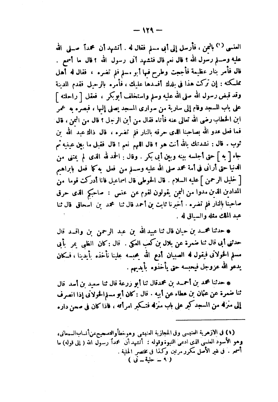 الْعَنْسِيُّ بِالْيَمَنِ فَأَرْسَلَ إِلَى أَبِي مُسْلِمٍ فَقَالَ لَهُ: أَتَشْهَدُ أَنَّ مُحَمَّدًا صَلَّى اللهُ عَلَيْهِ وَسَلَّمَ رَسُولُ اللهِ؟ قَالَ: «نَعَمْ» قَالَ: فَتَشْهَدُ أَنِّي رَسُولُ اللهِ؟ قَالَ: «مَا أَسْمَعُ» قَالَ: فَأَمَرَ بِنَارٍ عَظِيمَةٍ فَأُجِّجَتْ وَطُرِحَ فِيهَا أَبُو مُسْلِمٍ فَلَمْ تَضُرَّهُ فَقَالَ لَهُ أَهْلُ مَمْلَكَتِهِ: إِنْ تَرَكْتَ هَذَا فِي بَلَدِكَ أَفْسَدَهَا عَلَيْكَ فَأَمَرَهُ بِالرَّحِيلِ فَقَدِمَ الْمَدِينَةَ وَقَدْ قُبِضَ رَسُولُ اللهِ صَلَّى اللهُ عَلَيْهِ وَسَلَّمَ وَاسْتُخْلِفَ أَبُو بَكْرٍ فَعَقَلَ رَاحِلَتَهُ عَلَى بَابِ الْمَسْجِدِ وَقَامَ إِلَى سَارِيَةٍ مِنْ سَوَارِي الْمَسْجِدِ يُصَلِّي إِلَيْهَا فَبَصُرَ بِهِ عُمَرُ بْنُ الْخَطَّابِ رَضِيَ اللهُ تَعَالَى عَنْهُ فَأَتَاهُ فَقَالَ: مِنْ أَيْنَ الرَّجُلُ؟ قَالَ: مِنَ الْيَمَنِ قَالَ: فَمَا فَعَلَ عَدُوُّ اللهِ بِصَاحِبِنَا الَّذِي حَرَّقَهُ بِالنَّارِ فَلَمْ تَضُرَّهُ؟ قَالَ: «ذَاكَ عَبْدُ اللهِ بْنُ ثَوْبٍ» قَالَ: نَشَدْتُكَ بِاللهِ أَنْتَ هُوَ؟ قَالَ: «اللهُمَّ نَعَمْ» قَالَ: فَقَبَّلَ مَا بَيْنَ عَيْنَيْهِ ثُمَّ جَاءَ بِهِ حَتَّى أَجْلَسَهُ بَيْنَهُ وَبَيْنَ أَبِي بَكْرٍ وَقَالَ: §الْحَمْدُ لِلَّهِ الَّذِي لَمْ يُمِتْنِي مِنَ الدُّنْيَا حَتَّى أَرَانِي فِي أُمَّةِ مُحَمَّدٍ صَلَّى اللهُ عَلَيْهِ وَسَلَّمَ مَنْ فُعِلَ بِهِ كَمَا فُعِلَ بِإِبْرَاهِيمَ خَلِيلِ الرَّحْمَنِ عَلَيْهِ السَّلَامُ قَالَ الْحَوْطِيُّ: قَالَ إِسْمَاعِيلُ: فَأَنَا أَدْرَكْتُ قَوْمًا مِنَ الْمَدَّادِينَ الَّذِينَ مَدُّوا مِنَ الْيَمَنِ يَقُولُونَ لِقَوْمٍ مِنْ عَنْسٍ: صَاحِبُكُمُ الَّذِي حَرَّقَ صَاحِبَنَا بِالنَّارِ فَلَمْ تَضُرَّهُ أَخْبَرَنَا ثَابِتُ بْنُ أَحْمَدَ، قَالَ: ثنا مُحَمَّدُ بْنُ إِسْحَاقَ، قَالَ: ثنا عَبْدُ الْمَلِكِ مِثْلَهُ وَالسِّيَاقُ لَهُ