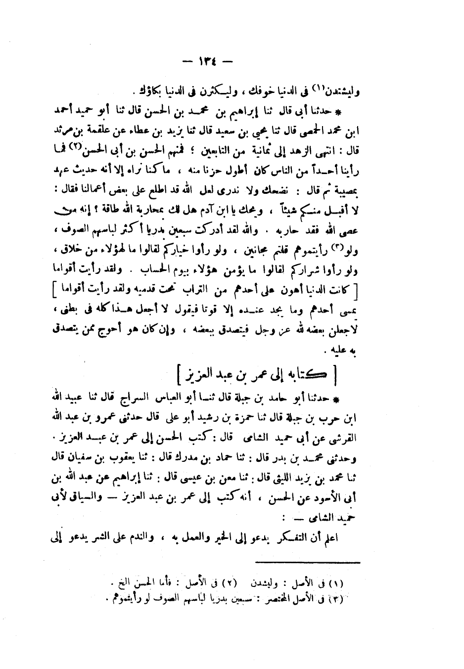 كِتَابُهُ إِلَى عُمَرَ بْنِ عَبْدِ الْعَزِيزِ حَدَّثَنَا أَبُو حَامِدِ بْنُ جَبَلَةَ، قَالَ: ثنا أَبُو الْعَبَّاسِ السَّرَّاجُ، قَالَ: ثنا عَبْدُ اللهِ بْنُ حَرْبِ بْنِ جَبَلَةَ قَالَ: ثنا حَمْزَةُ بْنُ رُشَيْدٍ أَبُو عَلِيٍّ، قَالَ: حَدَّثَنِي عَمْرُو بْنُ عَبْدِ اللهِ الْقُرَشِيُّ، عَنْ أَبِي حُمَيْدٍ الشَّامِيِّ، قَالَ: كَتَبَ الْحَسَنُ إِلَى عُمَرَ بْنِ عَبْدِ الْعَزِيزِ وَحَدَّثَنِي مُحَمَّدُ بْنُ بَدْرٍ، قَالَ: ثنا حَمَّادُ بْنُ مُدْرِكٍ قَالَ: ثنا يَعْقُوبُ بْنُ سُفْيَانَ، قَالَ: ثنا مُحَمَّدُ بْنُ يَزِيدَ اللَّيْثِيُّ، قَالَ: ثنا مَعْنُ بْنُ عِيسَى قَالَ: ثنا إِبْرَاهِيمُ، عَنْ عَبْدِ اللهِ بْنِ أَبِي الْأَسْوَدِ، عَنِ الْحَسَنِ، أَنَّهُ كَتَبَ إِلَى عُمَرَ بْنِ عَبْدِ الْعَزِيزِ وَالسِّيَاقُ لِأَبِي حُمَيْدٍ الشَّامِيِّ: " §اعْلَمْ أَنَّ التَّفْكِّيرَ يَدْعُو إِلَى الْخَيْرِ وَالْعَمَلِ بِهِ، وَالنَّدَمَ عَلَى الشَّرِّ يَدْعُو إِلَى