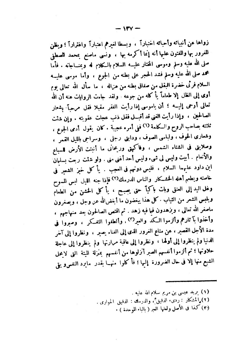 زَوَاهَا عَنْ أَنْبِيَائِهِ وَأَحِبَّائِهِ اخْتِبَارًا، وَبَسَطَهَا لِغَيْرِهِمُ اعْتِبَارًا وَاغْتِرَارًا، وَيَظُنُّ الْمَغْرُورُ بِهَا وَالْمَفْتُونُ عَلَيْهَا أَنَّهُ إِنَّمَا أَكْرَمَهُ بِهَا وَنَسِيَ مَا صَنَعَهُ بِمُحَمَّدٍ الْمُصْطَفَى صَلَّى اللهُ عَلَيْهِ وَسَلَّمَ وَمُوسَى الْمُخْتَارِ عَلَيْهِ السَّلَامُ بِالْكَلَامِ لَهُ وَبِمُنَاجَاتِهِ فَأَمَّا مُحَمَّدٌ صَلَّى اللهُ عَلَيْهِ وَسَلَّمَ فَشَدَّ الْحَجَرَ عَلَى بَطْنِهِ مِنَ الْجُوعِ وَأَمَّا مُوسَى عَلَيْهِ السَّلَامُ فَرُئِيَ خُضْرَةُ الْبَقْلِ مِنْ صِفَاقِ بَطْنِهِ مَنْ هُزَالِهِ، مَا سَأَلَ اللهَ تَعَالَى يَوْمَ أَوَى إِلَى الظِّلِّ إِلَّا طَعَامًا يَأْكُلُهُ مِنْ جُوعِهِ، وَلَقَدْ جَاءَتِ الرِّوَايَاتُ عَنْهُ أَنَّ اللهَ تَعَالَى أَوْحَى إِلَيْهِ أَنْ يَا مُوسَى إِذَا رَأَيْتَ الْفَقْرَ مُقْبِلًا فَقُلْ مَرْحَبًا بِشِعَارِ الصَّالِحِينَ، وَإِذَا رَأَيْتَ الْغِنَى قَدْ أَقْبَلَ فَقُلْ ذَنْبٌ عُجِّلَتْ عُقُوبَتُهُ وَإِنْ شِئْتَ ثَلَّثْتَهُ بِصَاحِبِ الرُّوحِ وَالْكَلِمَةِ فَفِي أَمْرِهِ عَجِيبَةٌ كَانَ يَقُولُ: أُدْمِي الْجُوعُ وَشِعَارِي الْخَوْفُ وَلِبَاسِي الصُّوفُ وَدَابَّتِي رِجْلَيَّ وَسِرَاجِي بِاللَّيْلِ الْقَمَرُ وَصِلَايَتِي فِي الشِّتَاءِ الشَّمْسُ، وَفَاكِهَتِي وَرَيْحَانِي مَا أَنْبَتَتِ الْأَرْضُ للسِّبَاعِ وَالْأَنْعَامِ، أَبِيتُ وَلَيْسَ لِي شَيْءٌ وَلَيْسَ أَحَدٌ أَغْنَى مِنِّي، وَلَوْ شِئْتَ رَبَّعْتَ بِسُلَيْمَانَ بْنِ دَاوُدَ عَلَيْهِمَا السَّلَامُ فَلَيْسَ دُونَهُمْ فِي الْعَجَبِ، يَأْكُلُ خُبْزَ الشَّعِيرِ فِي خَاصَّتِهِ وَيُطْعِمُ أَهْلَهُ الْخُشْكَارَ وَالنَّاسَ الدَّرْمَكَ فَإِذَا جَنَّهُ اللَّيْلُ لَبِسَ الْمُسُوحَ وَغَلَّ الْيَدَ إِلَى الْعُنُقِ وَبَاتَ بَاكِيًا حَتَّى يُصْبِحَ يَأْكُلُ الْخَشِنَ مِنَ الطَّعَامِ وَيَلْبَسُ الشَّعْرَ مِنَ الثِّيَابِ، كُلُّ هَذَا يُبْغِضُونَ مَا أَبْغَضَ اللهُ عَزَّ وَجَلَّ وَيُصَغِّرُونَ مَا صَغَّرَ اللهَ تَعَالَى وَيَزْهَدُونَ فِيمَا زَهَّدَ، ثُمَّ اقْتَصَّ الصَّالِحُونَ بَعْدُ مِنْهَاجَهُمْ وَأَخَذُوا بِآثَارِهِمْ وَأَلْزَمُوا الكَدَّ وَالْعِبَرَ، وَأَلْطَفُوا التَّفَكُّرَ وَصَبَرُوا فِي مُدَّةِ الْأَجَلِ الْقَصِيرِ عَنْ مَتَاعِ الْغُرُورِ، الَّذِي إِلَى الْفِنَاءِ يَصِيرُ، وَنَظَرُوا إِلَى آخِرِ الدُّنْيَا، وَلَمْ يَنْظُرُوا إِلَى أَوَّلِهَا وَنَظَرُوا إِلَى عَاقِبَةِ مَرَارَتِهَا، وَلَمْ يَنْظُرُوا إِلَى عَاجِلَةِ حَلَاوَتِهَا، ثُمَّ أَلْزَمُوا أَنْفُسَهُمُ الصَّبْرَ وَأَنْزَلُوهَا مِنْ أَنْفُسِهِمْ بِمَنْزِلَةِ الْمَيْتَةِ، الَّتِي لَا يَحِلُّ الشِّبَعُ مِنْهَا إِلَّا فِي حَالِ الضَّرُورَةِ إِلَيْهَا، فَأَكَلُوا مِنْهَا بِقَدْرِ مَا يَرُدُّ النَّفْسَ، وَيَقِي