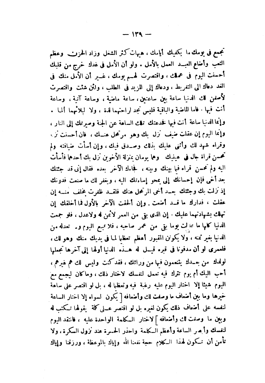تَجْمَعَ فِي يَوْمِكَ مَا يَكْفِيكَ أَيَّامَكَ هَيْهَاتَ كَثُرَ الشُّغُلُ وَزَادَ الْحُزْنُ وَعَظُمَ التَّعَبُ وَأَضَاعَ الْعَبْدُ الْعَمَلَ بِالْأَمَلِ، وَلَوْ أَنَّ الْأَمَلَ فِي غَدِكَ خَرَجَ مِنْ قَلْبِكَ أَحْسَنْتَ الْيَوْمَ فِي عَمَلِكَ وَاقْتَصَرْتَ لَهُمْ يَوْمَكَ، غَيْرَ أَنَّ الْأَمَلَ مِنْكَ فِي الْغَدِ دَعَاكَ إِلَى التَّفْرِيطِ وَدَعَاكَ إِلَى الْمَزِيدِ فِي الطَّلَبِ وَلَئِنْ شِئْتَ وَاقْتَصَرْتَ لَأَصِفَنَّ لَكَ الدُّنْيَا، سَاعَةٌ بَيْنَ سَاعَتَيْنِ، سَاعَةٌ مَاضِيَةٌ وَسَاعَةٌ آتِيَةٌ، وَسَاعَةٌ أَنْتَ فِيهَا فَأَمَّا الْمَاضِيَةُ وَالْآتِيَةُ، فَلَيْسَ تَجِدُ لِرَاحَتِهِمَا لَذَّةً وَلَا لِبَلَائِهِمَا أَلَمًا، وَإِنَّمَا الدُّنْيَا سَاعَةٌ أَنْتَ فِيهَا فَخَدَعَتْكَ تِلْكَ السَّاعَةُ عَنِ الْجَنَّةِ، وَصَيَّرَتْكَ إِلَى النَّارِ، وَإِنَّمَا الْيَوْمُ إِنْ عَقَلْتَ ضَيْفٌ نَزَلَ بِكَ وَهُوَ مُرْتَحِلٌ عَنْكَ، فَإِنْ أَحْسَنْتَ نُزُلَهُ وَقِرَاهُ شَهِدَ لَكَ وَأَثْنَى عَلَيْكَ بِذَلِكَ وَصَدَقَ فِيكَ، وَإِنْ أَسَأْتَ ضِيَافَتَهُ وَلَمْ تُحْسِنْ قِرَاهُ جَالَ فِي عَيْنَيْكَ، وَهُمَا يَوْمَانِ بِمَنْزِلَةِ الْأَخَوَيْنِ نَزَلَ بِكَ أَحَدُهُمَا فَأَسَأْتَ إِلَيْهِ وَلَمْ تُحْسِنْ قِرَاهُ فِيمَا بَيْنَكَ وَبَيْنَهُ فَجَاءَكَ الْآخَرُ بَعْدَهُ فَقَالَ: إِنِّي قَدْ جِئْتُكَ بَعْدَ أَخِي فَإِنَّ إِحْسَانَكَ إِلَيَّ يَمْحُو إِسَاءَتَكَ إِلَيْهِ وَيَغْفِرُ لَكَ مَا صَنَعْتَ، فَدُونَكَ إِذْ نَزَلَتُ بِكَ وَجِئْتُكَ بَعْدَ أَخِي الْمُرْتَحِلِ عَنْكَ، فَقَدْ ظَفَرْتَ بِخَلَفٍ مِنْهُ إِنْ عَقَلْتَ فَدَارِكْ مَا قَدْ أَضَعْتَ، وَإِنْ أَلْحَقْتَ الْآخِرَ بِالْأَوَّلِ فَمَا أَخْلَقَكَ أَنْ تَهْلَكَ بِشَهَادَتِهِمَا عَلَيْكَ إِنَّ الَّذِي بَقِيَ مِنَ الْعُمُرِ لَا ثَمَنَ لَهُ وَلَا عِدْلَ، فَلَوْ جَمَعْتَ الدُّنْيَا كُلَّهَا مَا عَدَلَتْ يَوْمًا بَقِيَ مِنْ عُمُرِ صَاحِبِهِ، فَلَا تَبِعِ الْيَوْمَ وَتَعْدِلُهُ مِنَ الدُّنْيَا بِغَيْرِ ثَمَنِهِ، وَلَا يَكُونَنَّ الْمَقْبُورُ أَعْظَمَ تَعْظِيمًا لِمَا فِي يَدَيْكَ مِنْكَ وَهُوَ لَكَ، فَلَعَمْرِي لَوْ أَنَّ مَدْفُونًا فِي قَبْرِهِ قِيلَ لَهُ: هَذِهِ الدُّنْيَا أَوَّلُهَا إِلَى آخِرِهَا تَجْعَلُهَا لِوَلَدِكَ مِنْ بَعْدِكَ يَتَنَعَّمُونَ فِيهَا مِنْ وَرَائِكَ _ فَقَدْ كُنْتَ وَلَيْسَ لَكَ هَمٌّ غَيْرُهُمْ _ أَحَبُّ إِلَيْكَ أَمْ يَوْمٌ تُتْرَكُ فِيهِ تَعْمَلُ لِنَفْسِكَ لَاخْتَارَ ذَلِكَ، وَمَا كَانَ لَيَجْمَعَ مَعَ الْيَوْمِ شَيْئًا إِلَّا اخْتَارَ الْيَوْمَ عَلَيْهِ؛ رَغْبَةً فِيهِ وَتَعْظِيمًا لَهُ بَلْ لَوِ اقْتَصَرَ عَلَى سَاعَةٍ خُيِّرَهَا وَمَا بَيْنَ أَضْعَافِ مَا وَصَفْتُ لَكَ وَأَضْعَافِهِ يَكُونُ لِسِوَاهُ، إِلَّا اخْتَارَ السَّاعَةَ لِنَفْسِهِ عَلَى أَضْعَافِ ذَلِكَ يَكُونُ لِغَيْرِهِ، بَلْ لَوِ اقْتَصَرَ عَلَى كَلِمَةٍ يَقُولُهَا تُكْتَبُ لَهُ وَبَيْنَ مَا وَصَفْتُ لَكَ وَأَضْعَافِهِ لَاخْتَارَ الْكَلِمَةَ الْوَاحِدَةَ عَلَيْهِ، فَانْتَقِدِ الْيَوْمَ لِنَفْسِكَ وَأَبْصِرِ السَّاعَةَ، وَأَعْظِمِ الْكَلِمَةَ، وَاحْذَرِ الْحَسْرَةَ عِنْدَ نُزُولِ السَّكْرَةِ، وَلَا تَأْمَنْ أَنْ تَكُونَ لِهَذَا الْكَلَامِ حُجَّةٌ، نَفَعَنَا اللهُ وَإِيَّاكَ بِالْمَوْعِظَةِ وَرَزَقَنَا وَإِيَّاكَ
