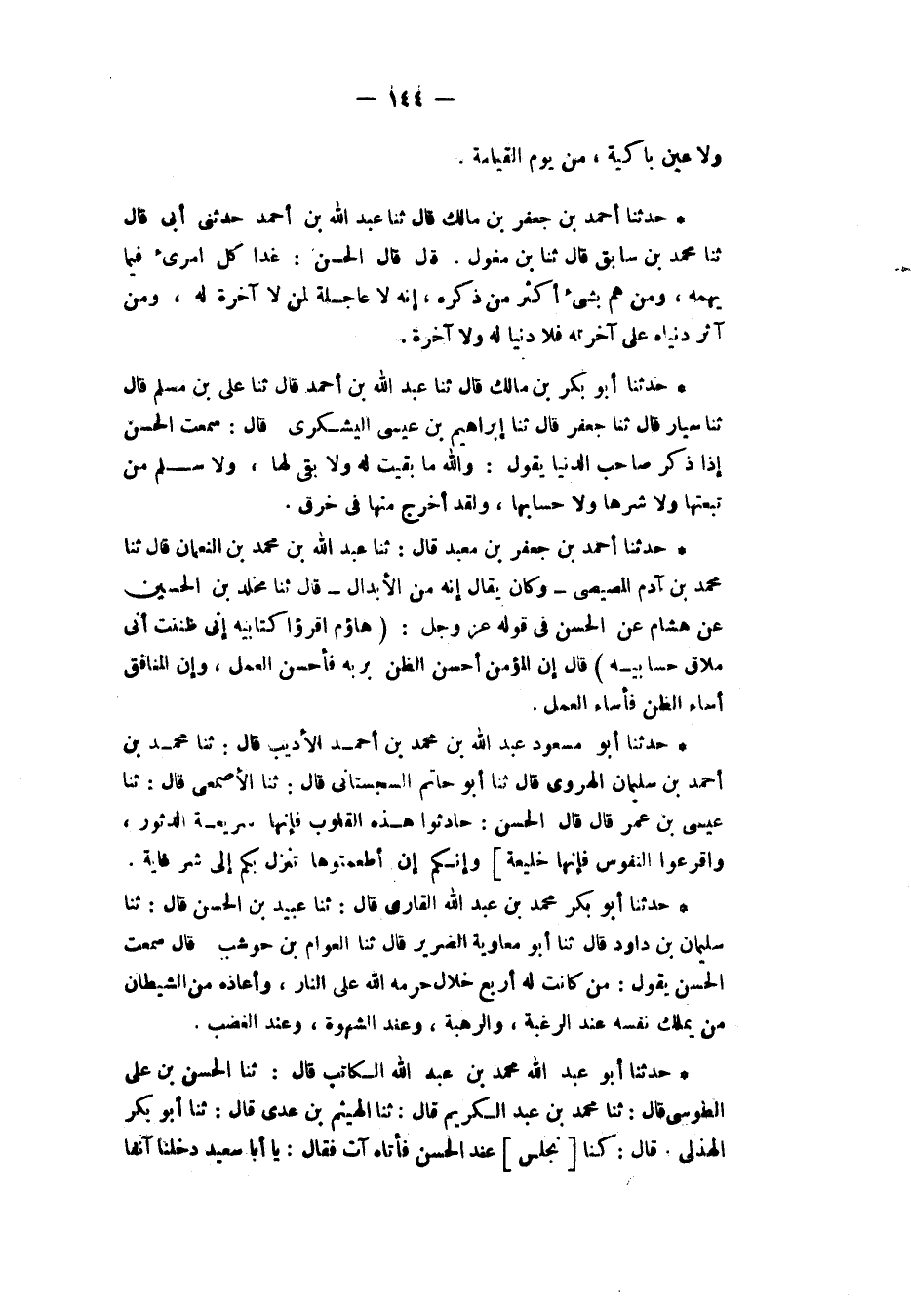 حَدَّثَنَا أَبُو عَبْدِ اللهِ مُحَمَّدُ بْنُ عَبْدِ اللهِ الْكَاتِبُ، قَالَ: ثنا الْحَسَنُ بْنُ عَلِيٍّ الطُّوسِيُّ، قَالَ: ثنا مُحَمَّدُ بْنُ عَبْدِ الْكَرِيمِ، قَالَ: ثنا الْهَيْثَمُ بْنُ عَدِيٍّ، قَالَ: ثنا أَبُو بَكْرٍ الْهُذَلِيُّ، قَالَ: كُنَّا نَجْلِسُ عِنْدَ الْحَسَنِ فَأَتَاهُ آتٍ فَقَالَ: يَا أَبَا سَعِيدٍ دَخَلْنَا آنِفًا -[145]- عَلَى عَبْدِ اللهِ بْنِ الْأَهْتَمِ فَإِذَا هُوَ يَجُودُ بِنَفْسِهِ فَقُلْنَا: يَا أَبَا مَعْمَرٍ كَيْفَ تَجِدُكَ؟ قَالَ: أَجِدُنِي وَاللهِ وَجِعًا وَلَا أَظُنُّنِي إِلَّا لَمَّا بِي وَلَكِنْ مَا تَقُولُونَ فِي مِائَةِ أَلْفٍ فِي هَذَا الصُّنْدُوقِ لَمْ تُؤَدَّ مِنْهَا زَكَاةٌ وَلَمْ يوصَلْ مِنْهَا رَحِمٌ فَقُلْنَا: يَا أَبَا مَعْمَرٍ فَلِمَ كُنْتَ تَجْمَعُهَا؟ قَالَ: كُنْتُ وَاللهِ أَجْمَعُهَا لِرَوْعَةِ الزَّمَانِ وَجَفْوَةِ السُّلْطَانِ وَمُكَاثَرَةِ الْعَشِيرَةِ فَقَالَ الْحَسَنُ: «§انْظُرُوا هَذَا الْبَائِسَ أَنَّى أَتَاهُ الشَّيْطَانُ فَحَذَّرَهُ رَوْعَةَ زَمَانِهِ وَجَفْوَةَ سُلْطَانِهِ عَمَّا اسْتَوْدَعَهُ اللهُ إِيَّاهُ وَعَمَّرَهُ فِيهِ خَرَجَ وَاللهِ مِنْهُ كَئِيبًا حَزِينًا ذَمِيمًا مَلُومًا، إِيهًا عَنْكَ أَيُّهَا الْوَارِثُ، لَا تُخْدَعُ كَمَا خُدِعَ صُوَيْحِبُكَ أَمَامَكَ أَتَاكَ هَذَا الْمَالُ حَلَالًا فَإِيَّاكَ وَإِيَّاكَ أَنْ يَكُونَ وَبَالًا عَلَيْكَ، أَتَاكَ وَاللهِ مِمَّنْ كَانَ لَهُ جَمُوعًا مَنُوعًا يَدْأَبُ فِيهِ اللَّيْلَ وَالنَّهَارَ يَقْطَعُ فِيهِ الْمَفَاوِزَ وَالْقِفَارَ، مِنْ بَاطِلٍ جَمَعَهُ وَمِنْ حَقٍّ مَنَعَهُ جَمَعَهُ فَأَوْعَاهُ وَشَدَّهُ فَأَوْكَاهُ لَمْ يُؤَدِّ مِنْهُ زَكَاةً وَلَمْ يَصِلْ مِنْهُ رَحِمًا إِنَّ يَوْمَ الْقِيَامَةِ ذُو حَسَرَاتٍ، وَإِنَّ أَعْظَمَ الْحَسَرَاتِ غَدًا أَنْ يَرَى أَحَدُكُمْ مَالَهُ فِي مِيزَانِ غَيْرِهِ أَوَتَدْرُونَ كَيْفَ ذَاكُمْ؟ رَجُلٌ آتَاهُ اللهُ مَالًا وَأَمَرَهُ بِإِنْفَاقِهِ فِي صُنُوفِ حُقُوقِ اللهِ فَبَخِلَ بِهِ فَوَرَّثَهُ هَذَا الْوَارِثَ فَهُوَ يَرَاهُ فِي مِيزَانِ غَيْرِهِ، فَيَا لَهَا عَثْرَةٌ لَا تُقَالُ وَتَوْبَةٌ لَا تُنَالُ»