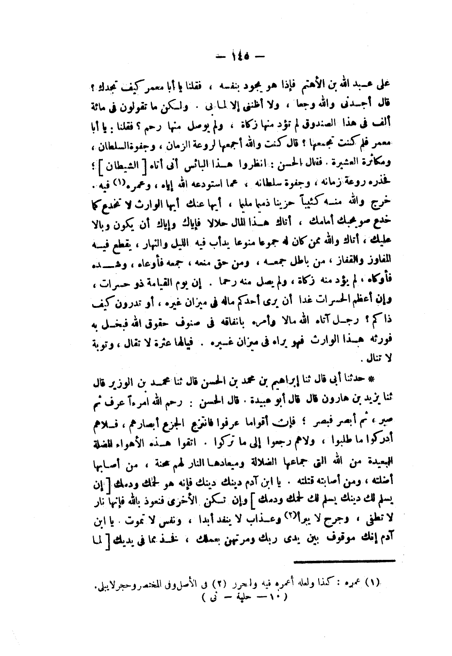 حَدَّثَنَا أَبِي قَالَ: ثنا إِبْرَاهِيمُ بْنُ مُحَمَّدِ بْنِ الْحَسَنِ، قَالَ: ثنا مُحَمَّدُ بْنُ الْوَزِيرِ، قَالَ: ثنا يَزِيدُ بْنُ هَارُونَ، قَالَ: قَالَ أَبُو عُبَيْدَةَ: قَالَ الْحَسَنُ: «§رَحِمَ اللهُ امْرَأً عَرَفَ ثُمَّ صَبَرَ ثُمَّ أَبْصَرَ فَبَصُرَ فَإِنَّ أَقْوَامًا عَرَفُوا فَانْتَزَعَ الْجَزَعُ أَبْصَارَهُمْ فَلَا هُمْ أَدْرَكُوا مَا طَلَبُوا وَلَا هُمْ رَجَعُوا إِلَى مَا تَرَكُوا، اتَّقُوا هَذِهِ الْأَهْوَاءَ الْمُضِلَّةَ الْبَعِيدَةَ مِنَ اللهِ الَّتِي جِمَاعُهَا الضَّلَالَةُ وَمِيعَادُهَا النَّارُ لَهُمْ مِحْنَةٌ مَنْ أَصَابَهَا أَضَلَّتْهُ وَمَنْ أَصَابَتْهُ قَتَلَتْهُ، يَا ابْنَ آدَمَ دِينَكَ دِينَكَ فَإِنَّهُ لَحْمُكَ وَدَمُكَ إِنْ يَسْلَمْ لَكَ دِينُكَ يَسْلَمْ لَكَ لَحْمُكَ وَدَمُكَ وَإِنْ تَكُنِ الْأُخْرَى فَنَعُوذُ بِاللهِ فَإِنَّهَا نَارٌ لَا تُطْفَأُ وَجُرْحٌ لَا يَبْرَأُ وَعَذَابٌ لَا يَنْفَدُ أَبَدًا وَنَفَسٌ لَا تَمُوتُ، يَا ابْنَ آدَمَ إِنَّكَ مَوْقُوفٌ بَيْنَ يَدَيْ رَبِّكَ وَمُرْتَهِنٌ بِعَمَلِكَ فَخُذْ مِمَّا فِي يَدَيْكَ لِمَا -[146]- بَيْنَ يَدَيْكَ، عِنْدَ الْمَوْتِ يَأْتِيكَ الْخَبَرُ إِنَّكَ مَسْئُولٌ وَلَا تَجِدُ جَوَابًا، وَإِنَّ الْعَبْدَ لَا يَزَالُ بِخَيْرٍ مَا كَانَ لَهُ وَاعِظٌ مِنْ نَفْسِهِ وَكَانَتِ الْمُحَاسَبَةُ مِنْ هَمِّهِ»
