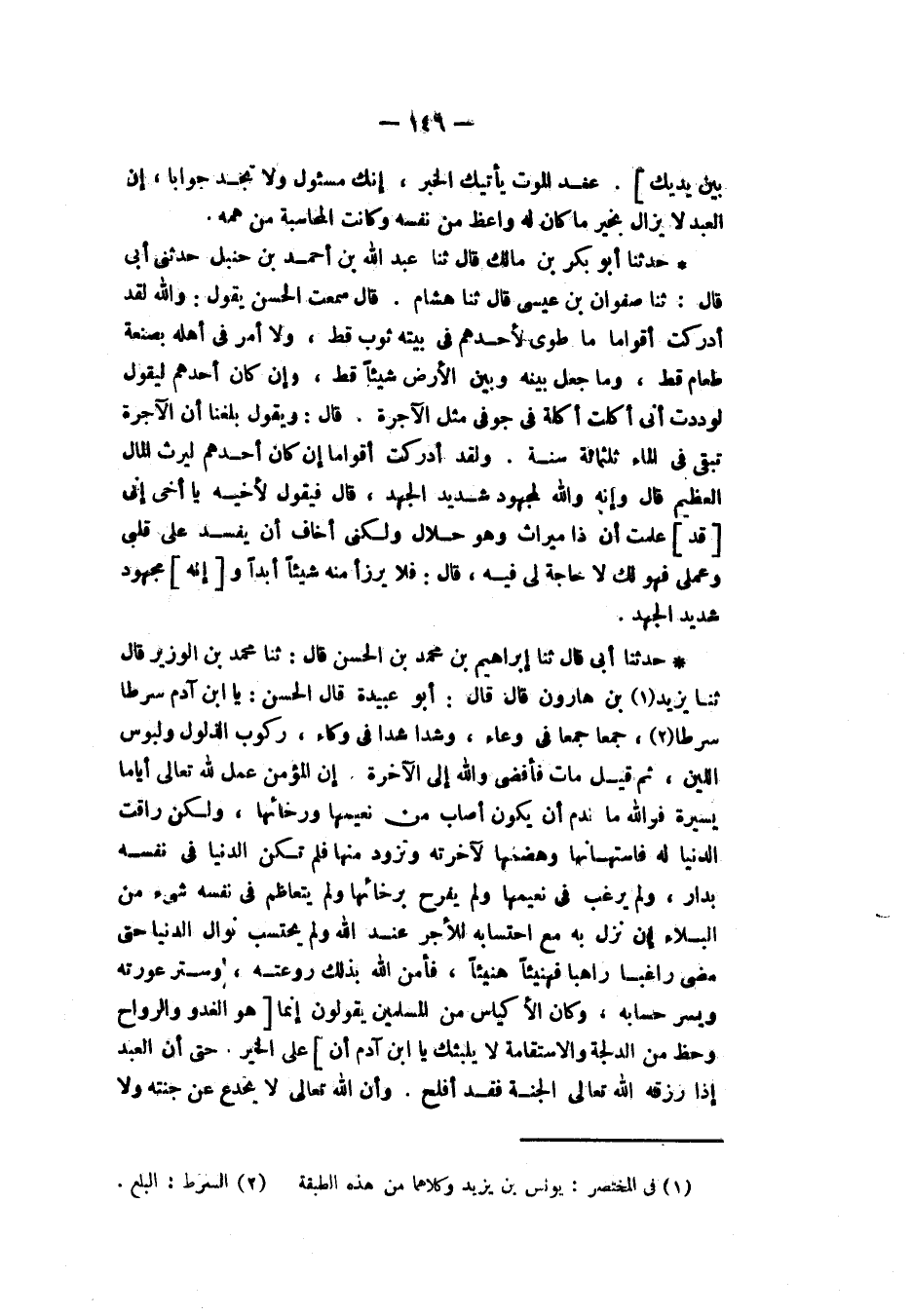 حَدَّثَنَا أَبِي قَالَ: ثنا إِبْرَاهِيمُ بْنُ مُحَمَّدِ بْنِ الْحَسَنِ، قَالَ: ثنا مُحَمَّدُ بْنُ الْوَزِيرِ، قَالَ: ثنا يَزِيدُ بْنُ هَارُونَ، قَالَ: قَالَ أَبُو عُبَيْدَةَ: قَالَ الْحَسَنُ: " يَا ابْنَ آدَمَ §سَرَطًا سَرَطًا جَمْعًا جَمْعًا فِي وِعَاءٍ، وَشَدًّا شَدًّا فِي وِكَاءٍ، رُكُوبَ الذَّلُولِ وَلَبُوسَ اللِّينِ ثُمَّ قِيلَ: مَاتَ فَأَفْضَى وَاللهِ إِلَى الْآخِرَةِ، إِنَّ الْمُؤْمِنَ عَمِلَ لِلَّهِ تَعَالَى أَيَّامًا يَسِيرَةً فَوَاللهِ مَا نَدِمَ أَنْ يَكُونَ أَصَابَ مِنْ نَعِيمِهَا وَرَخَائِهَا وَلَكِنْ رَاقَتِ الدُّنْيَا لَهُ فَاسْتَهَانَهَا وَهَضَمَهَا لِآخِرَتِهِ وَتَزَوَّدَ مِنْهَا، فَلَمْ تَكُنِ الدُّنْيَا فِي نَفْسِهِ بِدَارٍ وَلَمْ يرَغَبْ فِي نَعِيمِهَا وَلَمْ يَفْرَحْ بِرَخَائِهَا، وَلَمْ يَتَعَاظَمْ فِي نَفْسِهِ شَيْءٌ مِنَ الْبَلَاءِ إِنْ نَزَلَ بِهِ مَعَ احْتِسَابِهِ لِلْأَجْرِ عِنْدَ اللهِ، وَلَمْ يَحْتَسِبْ نَوَالَ الدُّنْيَا حَتَّى مَضَى رَاغِبًا رَاهِبًا فَهَنِيئًا هَنِيئًا فَأَمَّنَ اللهُ بِذَلِكَ رَوْعَتَهُ وَسَتَرَ عَوْرَتَهُ وَيَسَّرَ حِسَابَهُ، وَكَانَ الْأَكْيَاسُ مِنَ الْمُسْلِمِينَ يَقُولُونَ: إِنَّمَا هُوَ الْغُدُوُّ وَالرَّوَاحُ، وَحَظٌّ مِنَ الدُّلَجَةِ، وَالِاسْتِقَامَةُ، لَا يَثْنِكَ يَا ابْنَ آدَمَ ثَانٍ عَنِ الْخَيْرِ حَتَّى إِنَّ الْعَبْدَ إِذَا رَزَقَهُ اللهُ تَعَالَى الْجَنَّةَ فَقَدْ أَفْلَحَ، وَإِنَّ اللهَ تَعَالَى لَا يُخْدَعُ عَنْ جَنَّتِهِ، وَلَا -[147]- يُعْطِي بِالْأَمَانِي وَقَدِ اشْتَدَّ الشُّحُّ وَظَهَرَتِ الْأَمَانِيُّ وَتَمَنَّى الْمُتَمَنِّي فِي غُرُورِهِ "
