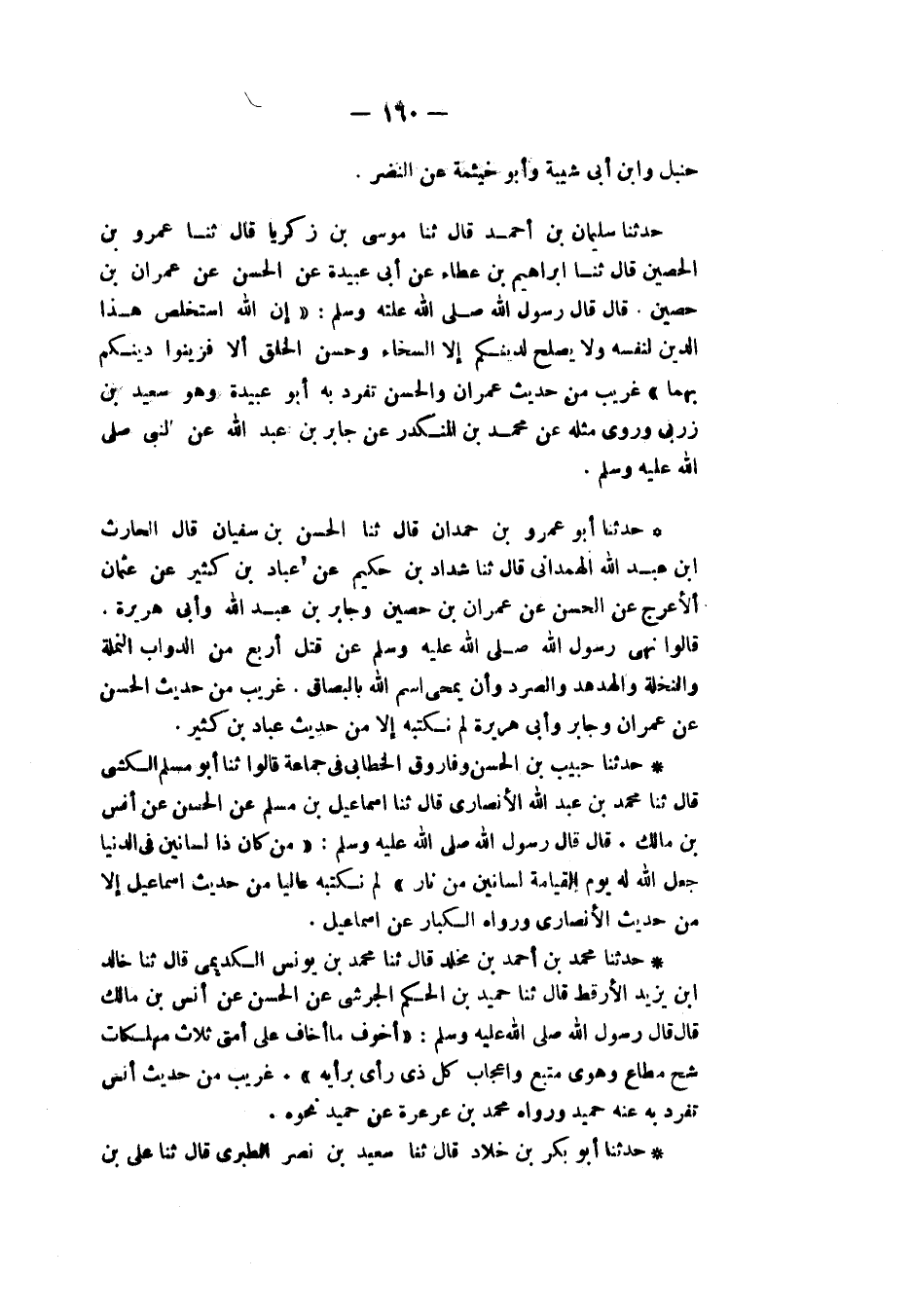 حَدَّثَنَا أَبُو عَمْرِو بْنُ حَمْدَانَ، قَالَ: ثنا الْحَسَنُ بْنُ سُفْيَانَ، قَالَ الْحَارِثُ بْنُ عَبْدِ اللهِ الْهَمْدَانِيُّ: قَالَ: ثنا شَدَّادُ بْنُ حَكِيمٍ، عَنْ عَبَّادِ بْنِ كَثِيرٍ، عَنْ عُثْمَانَ الْأَعْرَجِ، عَنِ الْحَسَنِ، عَنْ عِمْرَانَ بْنِ حُصَيْنٍ، وَجَابِرِ بْنِ عَبْدِ اللهِ، وَأَبِي هُرَيْرَةَ قَالُوا: " §نَهَى رَسُولُ اللهِ صَلَّى اللهُ عَلَيْهِ وَسَلَّمَ عَنْ قَتَلِ أَرْبَعٍ مِنَ الدَّوَابِّ: النَّمْلَةِ وَالنَّحْلَةِ وَالْهُدْهُدِ وَالصُّرَدِ وَأَنْ يُمْحَى اسْمُ اللهِ بِالْبُصَاقِ " غَرِيبٌ مِنْ حَدِيثِ الْحَسَنِ عَنْ عِمْرَانَ، وَجَابِرٍ، وَأَبِي هُرَيْرَةَ لَمْ نَكْتُبْهُ إِلَّا مِنْ حَدِيثِ عَبَّادِ بْنِ كَثِيرٍ