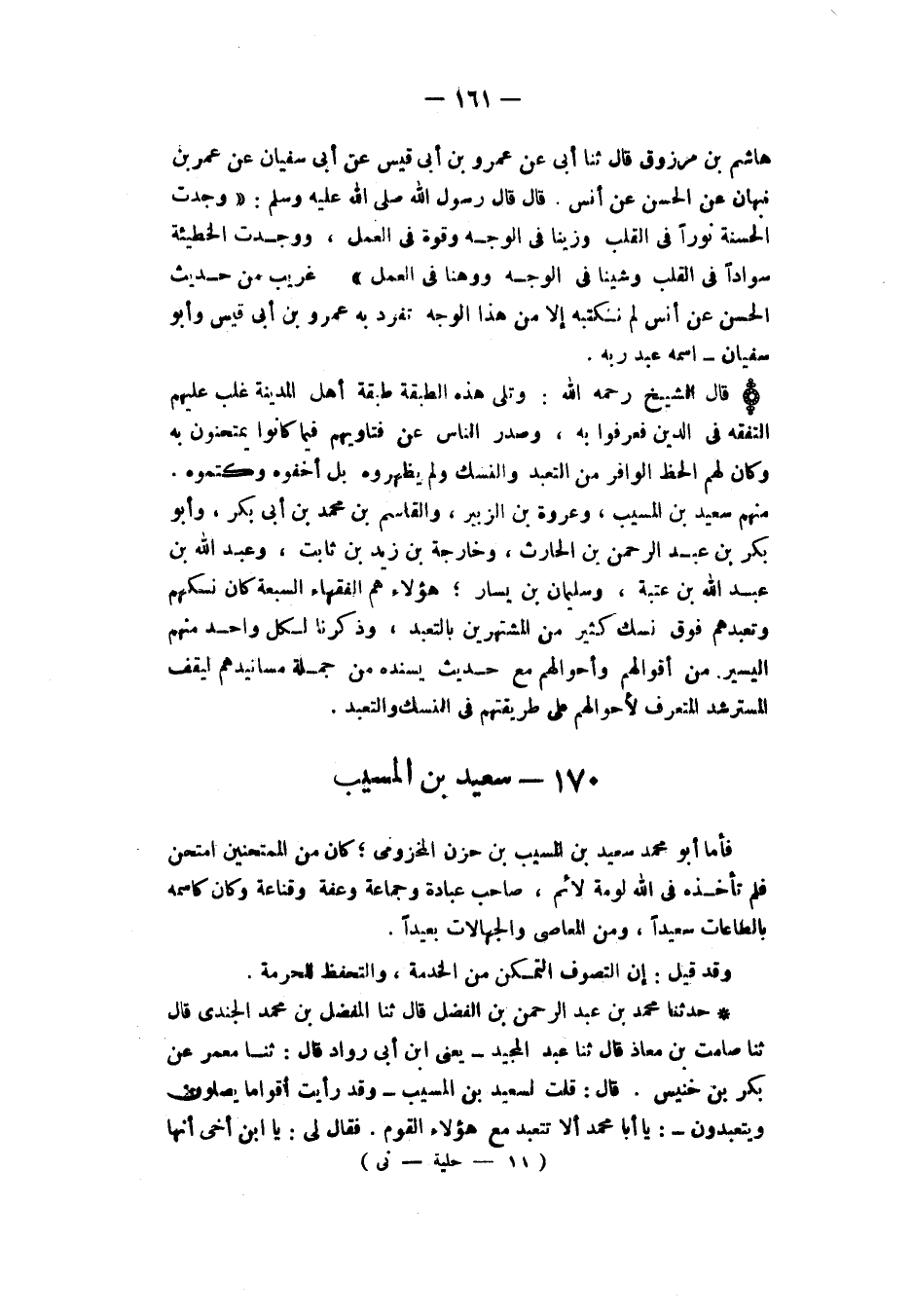 هَاشِمِ بْنِ مَرْزُوقٍ، قَالَ: ثنا أَبِي، عَنْ عَمْرِو بْنِ أَبِي قَيْسٍ، عَنْ أَبِي سُفْيَانَ، عَنْ عُمَرَ بْنِ نَبْهَانَ، عَنِ الْحَسَنِ، عَنْ أَنَسٍ، قَالَ: قَالَ رَسُولُ اللهِ صَلَّى اللهُ عَلَيْهِ وَسَلَّمَ: «§وَجَدْتُ الْحَسَنَةَ نُورًا فِي الْقَلْبِ وَزَيْنًا فِي الْوَجْهِ وَقُوَّةً فِي الْعَمَلِ وَوَجَدْتُ الْخَطِيئَةَ سَوَادًا فِي الْقَلْبِ وَشَيْنًا فِي الْوَجْهِ وَوَهْنًا فِي الْعَمَلِ» غَرِيبٌ مِنْ حَدِيثِ الْحَسَنِ عَنْ أَنَسٍ، لَمْ نَكْتُبْهُ إِلَّا مِنْ هَذَا الْوَجْهِ تَفَرَّدَ بِهِ عَمْرُو بْنُ أَبِي قَيْسٍ وَأَبُو سُفْيَانَ اسْمُهُ عَبْدُ رَبِّهِ قَالَ الشَّيْخُ رَحِمَهُ اللهُ: وَتِلي هَذِهِ الطَّبَقَةَ طَبَقَةُ أَهْلِ الْمَدِينَةِ غَلَبَ عَلَيْهِمُ التَّفَقُّهُ فِي الدِّينِ فَعُرِفُوا بِهِ وَصَدْرَ النَّاسُ عَنْ فَتَاوِيهِمْ، فِيمَا كَانُوا يُمْتَحَنُونَ بِهِ وَكَانَ لَهُمُ الْحَظُّ الْوَافِرُ مِنَ التَّعَبُّدِ وَالنُّسُكِ وَلَمْ يُظْهِرُوهُ بَلْ أَخْفَوْهُ وَكَتَمُوهُ: مِنْهُمْ: سَعِيدُ بْنُ الْمُسَيِّبِ، وَعُرْوَةُ بْنُ الزُّبَيْرِ، وَالْقَاسِمُ بْنُ مُحَمَّدِ بْنِ أَبِي بَكْرٍ، وَأَبُو بَكْرِ بْنُ عَبْدِ الرَّحْمَنِ بْنِ الْحَارِثِ، وَخَارِجَةُ بْنُ زَيْدِ بْنِ ثَابِتٍ، وَعُبَيْدُ اللهِ بْنُ عَبْدِ اللهِ بْنِ عُتْبَةَ، وَسُلَيْمَانُ بْنُ يَسَارٍ هَؤُلَاءِ هُمُ الْفُقَهَاءُ السَّبْعَةُ كَانَ نُسُكُهُمْ وَتَعَبُّدُهُمْ فَوْقَ نُسُكِ كَثِيرٍ مِنَ الْمُشْتَهِرِينَ بِالتَّعَبُّدِ وَذَكَرْنَا لِكُلِّ وَاحِدٍ مِنْهُمُ الْيَسِيرَ مِنْ أَقْوَالِهِمْ وَأَحْوَالِهِمْ مَعَ حَدِيثٍ يُسْنِدُهُ مِنْ جُمْلَةِ مَسَانِيدِهِمْ لَيَقِفَ الْمُسْتَرْشِدُ الْمُتَعَرِّفُ لِأَحْوَالِهِمْ عَلَى طَرِيقَتِهِمْ فِي النُّسُكِ وَالتَّعَبُّدِ
