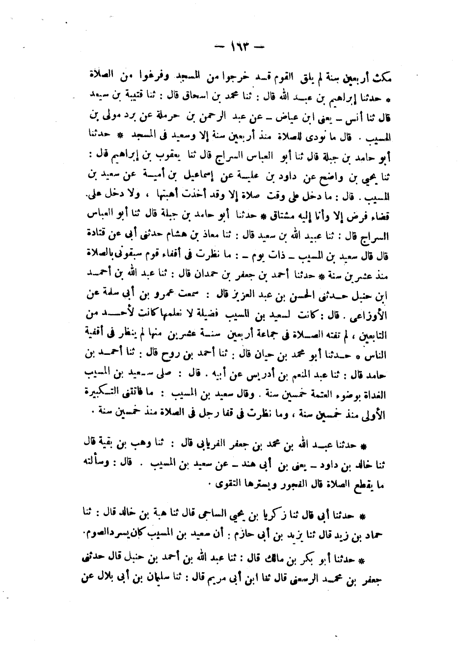 حَدَّثَنَا أَبُو حَامِدِ بْنُ جَبَلَةَ، قَالَ: ثنا أَبُو الْعَبَّاسِ السَّرَّاجُ، قَالَ: ثنا عُبَيْدُ اللهِ بْنُ سَعِيدٍ، قَالَ: ثنا مُعَاذُ بْنُ هِشَامٍ، حَدَّثَنِي أَبِي، عَنْ قَتَادَةَ، قَالَ: قَالَ سَعِيدُ بْنُ الْمُسَيِّبِ ذَاتَ يَوْمٍ: «§مَا نَظَرْتُ فِي أَقْفَاءِ قَوْمٍ سَبَقُونِي بِالصَّلَاةِ مُنْذُ عِشْرِينَ سَنَةً»