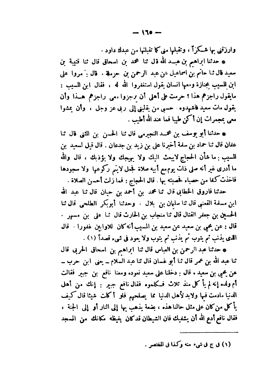 حَدَّثَنَا عَبْدُ الرَّحْمَنِ بْنُ الْعَبَّاسِ، قَالَ: ثنا إِبْرَاهِيمُ بْنُ إِسْحَاقَ الْحَرْبِيُّ، قَالَ: ثنا عَبْدُ اللهِ بْنُ عُمَرَ، قَالَ: ثنا أَبُو غَسَّانَ، قَالَ: ثنا عَبْدُ السَّلَامِ يَعْنِي ابْنَ حَرْبٍ، عَنْ يَحْيَى بْنِ سَعِيدٍ، قَالَ: دَخَلْنَا عَلَى سَعِيدٍ نَعُودُهُ وَمَعَنَا نَافِعُ بْنُ جُبَيْرٍ فَقَالَتْ أُمُّ وَلَدِهِ: إِنَّهُ لَمْ يَأْكُلْ مُنْذُ ثَلَاثٍ فَكَلَّمُوهُ فَقَالَ نَافِعُ بْنُ جُبَيْرٍ: إِنَّكَ مِنْ أَهْلِ الدُّنْيَا مَا دُمْتَ فِيهَا وَلَا بُدَّ لِأَهْلِ الدُّنْيَا مِمَّا يُصْلِحُهُمْ فَلَوْ أَكَلْتَ شَيْئًا؟ قَالَ: " §كَيْفَ يَأْكُلُ مَنْ كَانَ عَلَى مِثْلِ حَالِنَا هَذِهِ، بَضْعَةٌ يُذْهَبُ بِهَا إِلَى النَّارِ أَوْ إِلَى الْجَنَّةِ؟ فَقَالَ نَافِعٌ: ادْعُ اللهَ أَنْ يَشْفِيَكَ فَإِنَّ الشَّيْطَانَ قَدْ كَانَ يَغْبِطُهُ مَكَانُكَ مِنَ الْمَسْجِدِ -[166]- قَالَ: «بَلْ أَخْرَجَنِي اللهُ تَعَالَى مِنْ بَيْنِكُمْ سَالِمًا»