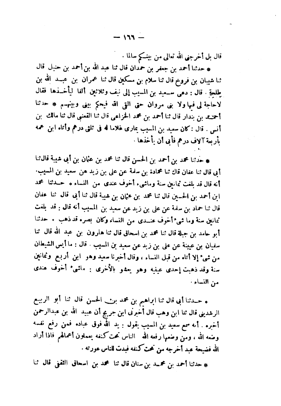 حَدَّثَنَا أَحْمَدُ بْنُ جَعْفَرِ بْنِ حَمْدَانَ، قَالَ: ثنا عَبْدُ اللهِ بْنُ أَحْمَدَ بْنِ حَنْبَلٍ، قَالَ: ثنا شَيْبَانُ بْنُ فَرُّوخَ، قَالَ: ثنا سَلَّامُ بْنُ مِسْكِينٍ، قَالَ: ثنا عِمْرَانُ بْنُ عَبْدِ اللهِ بْنِ طَلْحَةَ، قَالَ: دُعِيَ سَعِيدُ بْنُ الْمُسَيِّبِ إِلَى نَيِّفٍ وَثَلَاثِينَ أَلْفًا لِيَأْخُذَهَا فَقَالَ: «§لَا حَاجَةَ لِي فِيهَا وَلَا بَنِي مَرْوَانَ حَتَّى أَلْقَى اللهَ فَيَحْكُمُ بَيْنِي وَبَيْنَهُمْ»
