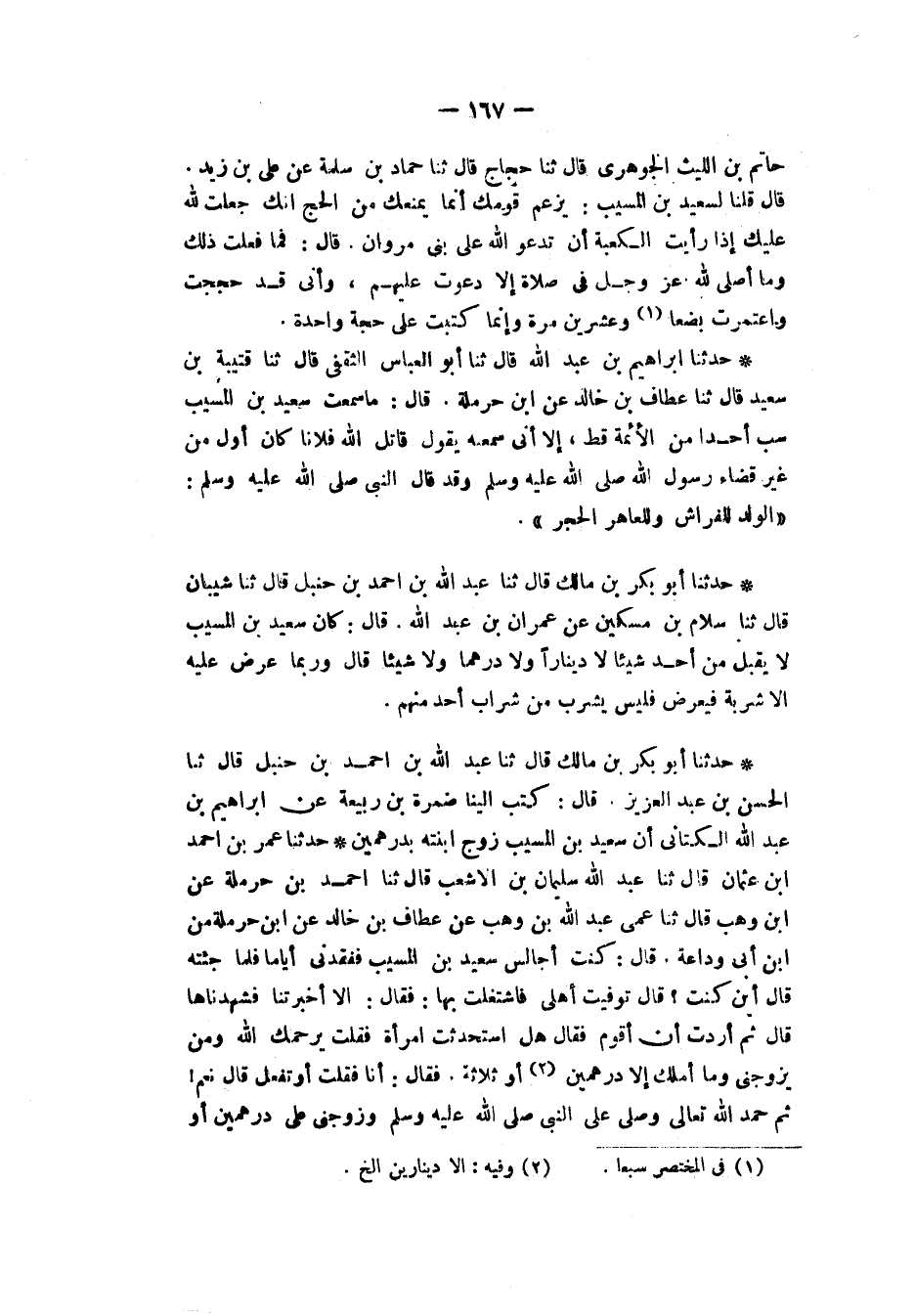 حَدَّثَنَا أَبُو بَكْرِ بْنُ مَالِكٍ، قَالَ: ثنا عَبْدُ اللهِ بْنُ أَحْمَدَ بْنِ حَنْبَلٍ، قَالَ: ثنا الْحَسَنُ بْنُ عَبْدِ الْعَزِيزِ، قَالَ: كَتَبَ إِلَيْنَا ضَمْرَةُ بْنُ رَبِيعَةَ، عَنْ إِبْرَاهِيمَ بْنِ عَبْدِ اللهِ الْكِتَّانِيِّ، أَنَّ سَعِيدَ بْنَ الْمُسَيِّبِ، «§زَوَّجَ ابْنَتَهُ بِدِرْهَمَيْنِ»