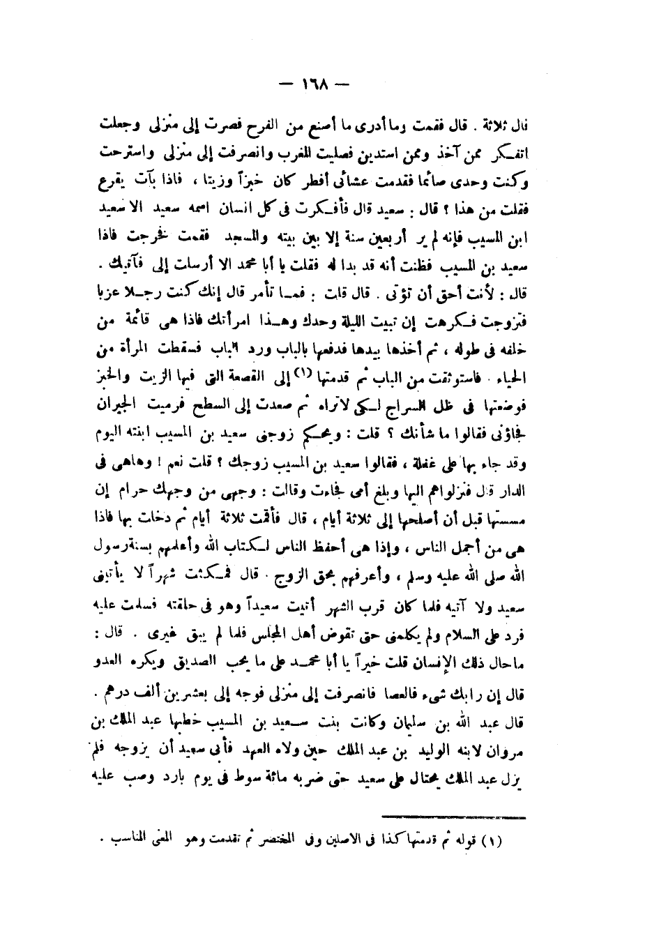 قَالَ: ثَلَاثَةٍ قَالَ: فَقُمْتُ وَلَا أَدْرِي مَا أَصْنَعُ مِنَ الْفَرَحِ فَصِرْتُ إِلَى مَنْزِلِي وَجَعَلْتُ أَتَفَكَّرُ مِمَّنْ آخُذُ وَمِمَّنْ أَسْتَدِينُ فَصَلَّيْتُ الْمَغْرِبَ وَانْصَرَفْتُ إِلَى مَنْزِلِي وَاسْتَرَحْتُ وَكُنْتُ وَحْدِي صَائِمًا فَقَدَّمْتُ عَشَائِي أَفْطَرُ كَانَ خُبْزًا وَزَيْتًا فَإِذَا بِآتٍ يَقْرَعُ فَقُلْتُ: مَنْ هَذَا؟ قَالَ: سَعِيدٌ قَالَ: فَتَفَكَّرْتُ فِي كُلِّ إِنْسَانٍ اسْمُهُ سَعِيدٌ إِلَّا سَعِيدَ بْنَ الْمُسَيِّبِ فَإِنَّهُ لَمْ يُرَ أَرْبَعِينَ سَنَةً إِلَّا بَيْنَ بَيْتِهِ وَالْمَسْجِدِ فَقُمْتُ فَخَرَجْتُ فَإِذَا سَعِيدُ بْنُ الْمُسَيِّبِ فَظَنَنْتُ أَنَّهُ قَدْ بَدَا لَهُ فَقُلْتُ: يَا أَبَا مُحَمَّدٍ أَلَا أَرْسَلْتَ إِلَيَّ فَآتِيَكَ قَالَ: لَأَنْتَ أَحَقُّ أَنْ تُؤْتَى قَالَ: قُلْتُ: فَمَا تَأْمُرُ؟ قَالَ: إِنَّكَ كُنْتَ رَجُلًا عَزَبًا فَتَزَوَّجْتَ فَكَرِهْتُ أَنْ تَبِيتَ اللَّيْلَةَ وَحْدَكَ، وَهَذِهِ امْرَأَتُكَ فَإِذَا هِيَ قَائِمَةٌ مِنْ خَلْفِهِ فِي طُولِهِ ثُمَّ أَخَذَهَا بِيَدِهَا فَدَفَعَهَا بِالْبَابِ وَرَدَّ الْبَابَ فَسَقَطَتِ الْمَرْأَةُ مِنَ الْحَيَاءِ فَاسْتَوْثَقَتْ مِنَ الْبَابِ ثُمَّ قَدَّمْتُهَا إِلَى الْقَصْعَةِ الَّتِي فِيهَا الزَّيْتُ وَالْخُبْزُ فَوَضَعْتُهَا فِي ظِلِّ السِّرَاجِ لِكَيْ لَا تَرَاهُ ثُمَّ صَعَدْتُ إِلَى السَّطْحِ فَرَمَيْتُ الْجِيرَانَ فَجَاءُونِي فَقَالُوا: مَا شَأْنُكَ؟ قُلْتُ: وَيْحَكُمْ زَوَّجَنِي سَعِيدُ بْنُ الْمُسَيِّبِ ابْنَتَهُ الْيَوْمَ وَقَدْ جَاءَ بِهَا عَلَى غَفْلَةٍ فَقَالُوا: سَعِيدُ بْنُ الْمُسَيِّبِ زَوَّجَكَ؟ قُلْتُ: نَعَمْ وَهَا هِيَ فِي الدَّارِ قَالَ: فَنَزَلُوا هُمْ إِلَيْهَا وَبَلَغَ أُمِّي فَجَاءَتْ وَقَالَتْ: وَجْهِي مِنْ وَجْهِكِ حَرَامٌ إِنْ مَسَسْتَهَا قَبْلَ أَنْ أُصْلِحَهَا إِلَى ثَلَاثَةِ أَيَّامٍ قَالَ: فَأَقَمْتُ ثَلَاثَةَ أَيَّامٍ ثُمَّ دَخَلْتُ بِهَا فَإِذَا هِيَ مِنْ أَجْمَلِ النَّاسِ وَإِذَا هِيَ مِنْ أَحْفَظِ النَّاسِ لِكِتَابِ اللهِ وَأَعْلَمِهِمْ بِسُنَّةِ رَسُولِ اللهِ صَلَّى اللهُ عَلَيْهِ وَسَلَّمَ وَأَعْرِفِهِمْ بِحَقِّ الزَّوْجِ قَالَ: فَمَكَثْتُ شَهْرًا لَا يَأْتِينِي سَعِيدٌ وَلَا آتِيهِ فَلَمَّا كَانَ قُرْبُ الشَّهْرِ أَتَيْتُ سَعِيدًا وَهُوَ فِي حَلْقَتِهِ فَسَلَّمْتُ عَلَيْهِ فَرَدَّ عَلَيَّ السَّلَامَ وَلَمْ يكَلِّمْنِي حَتَّى تَقَوَّضَ أَهْلُ الْمَجْلِسِ فَلَمَّا لَمْ يَبْقَ غَيْرِي قَالَ: مَا حَالُ ذَلِكَ الْإِنْسَانُ؟ قُلْتُ: خَيْرًا يَا أَبَا مُحَمَّدٍ عَلَى مَا يُحِبُّ الصَّدِيقُ وَيَكْرَهُ الْعَدُوُّ قَالَ: إِنْ رَابَكَ شَيْءٌ فَالْعَصَا فَانْصَرَفْتُ إِلَى مَنْزِلِي فَوَجَّهَ إِلَيَّ بِعِشْرِينَ أَلْفَ دِرْهَمٍ " قَالَ عَبْدُ اللهِ بْنُ سُلَيْمَانَ: وَكَانَتْ بِنْتُ سَعِيدِ بْنِ الْمُسَيِّبِ خَطَبَهَا عَبْدُ الْمَلِكِ بْنُ مَرْوَانَ لِابْنِهِ الْوَلِيدِ بْنِ عَبْدِ الْمَلِكِ حِينَ وَلَّاهُ الْعَهْدَ فَأَبَى سَعِيدٌ أَنْ يُزَوِّجَهُ فَلَمْ يَزَلْ عَبْدُ الْمَلِكِ يَحْتَالُ عَلَى سَعِيدٍ حَتَّى ضَرَبَهُ مِائَةَ سَوْطٍ فِي يَوْمٍ بَارِدٍ وَصَبَّ عَلَيْهِ