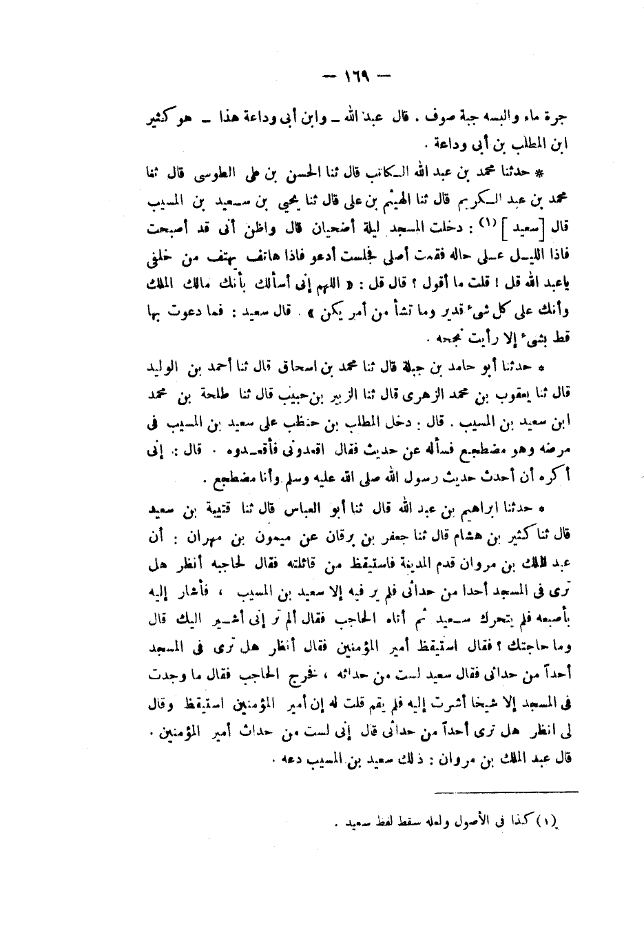 حَدَّثَنَا إِبْرَاهِيمُ بْنُ عَبْدِ اللهِ، قَالَ: ثنا أَبُو الْعَبَّاسِ، قَالَ: ثنا قُتَيْبَةُ بْنُ سَعِيدٍ، قَالَ: ثنا كَثِيرُ بْنُ هِشَامٍ، قَالَ: ثنا جَعْفَرُ بْنُ بُرْقَانَ، عَنْ مَيْمُونِ بْنِ مِهْرَانَ: أَنَّ عَبْدَ الْمَلِكِ بْنَ مَرْوَانَ، قَدِمَ الْمَدِينَةَ فَاسْتَيْقَظَ مِنْ قَائِلَتِهِ فَقَالَ لِحَاجِبِهِ: §انْظُرْ هَلْ تَرَى فِي الْمَسْجِدِ أَحَدًا مِنْ حُدَّاثِي فَلَمْ يَرَى فِيهِ إِلَّا سَعِيدَ بْنَ الْمُسَيِّبِ فَأَشَارَ إِلَيْهِ بِإِصْبَعِهِ فَلَمْ يَتَحَرَّكْ سَعِيدٌ ثُمَّ أَتَاهُ الْحَاجِبُ فَقَالَ: أَلَمْ تَرَ أَنِّي أُشِيرُ إِلَيْكَ؟ قَالَ: «وَمَا حَاجَتُكَ؟» فَقَالَ: اسْتَيْقَظَ أَمِيرُ الْمُؤْمِنِينَ فَقَالَ: انْظُرْ هَلْ تَرَى فِي الْمَسْجِدِ أَحَدًا مِنْ حُدَّاثِي فَقَالَ لَهُ سَعِيدٌ لَسْتُ مِنْ حُدَّاثِهِ فَخَرَجَ الْحَاجِبُ فَقَالَ: مَا وَجَدْتُ فِي الْمَسْجِدِ إِلَّا شَيْخًا أَشَرْتُ إِلَيْهِ فَلَمْ يَقُمْ قُلْتُ لَهُ: إِنَّ أَمِيرَ الْمُؤْمِنِينَ اسْتَيْقَظَ وَقَالَ لِي انْظُرْ هَلْ تَرَى أَحَدًا مِنْ حُدَّاثِي قَالَ: إِنِّي لَسْتُ مِنْ حُدَّاثِ أَمِيرِ الْمُؤْمِنِينَ قَالَ عَبْدُ الْمَلِكِ بْنُ مَرْوَانَ: ذَلِكَ سَعِيدُ بْنُ الْمُسَيِّبِ دَعْهُ "