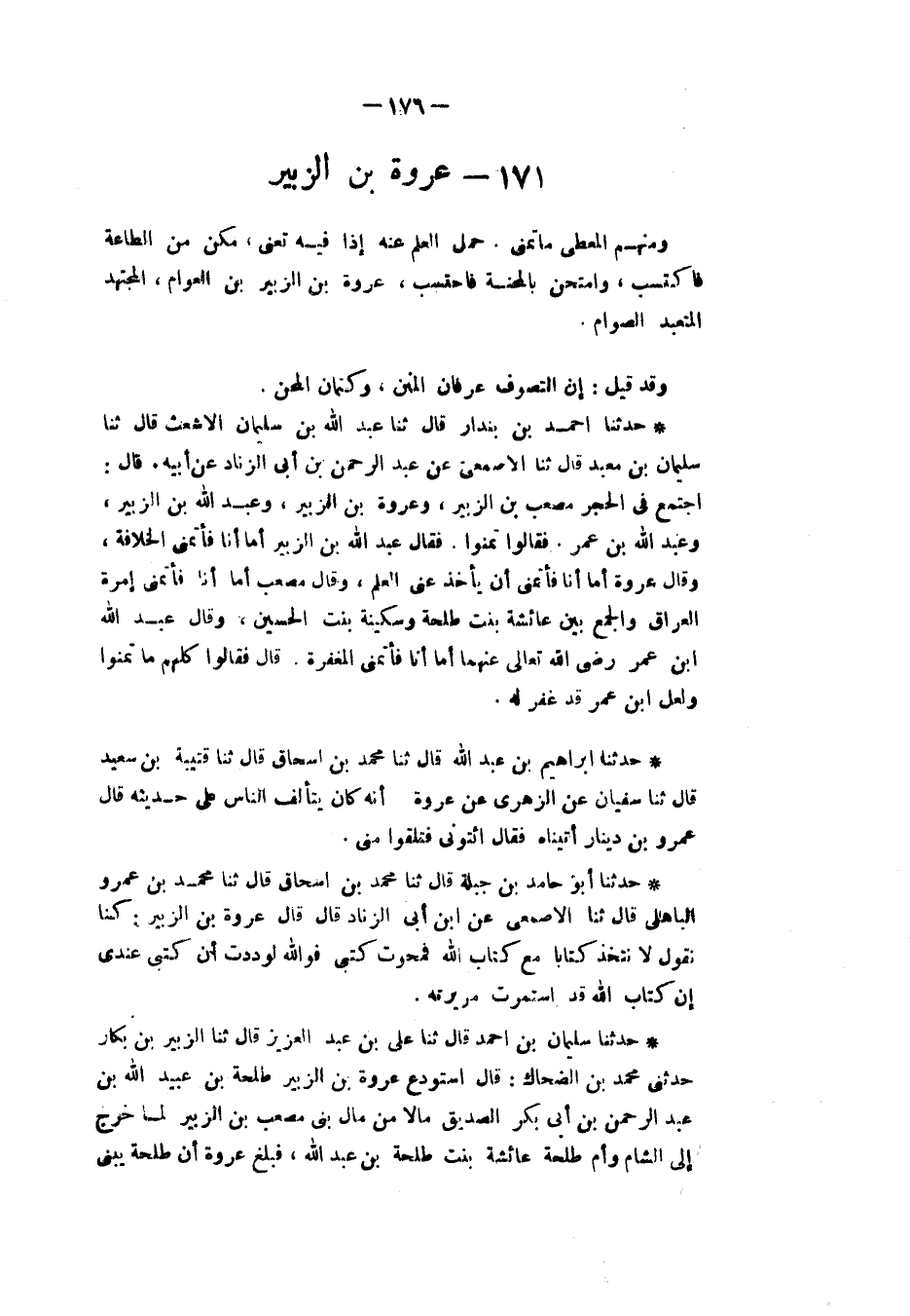 §عُرْوَةُ بْنُ الزُّبَيْرِ وَمِنْهُمُ الْمُعْطِي مَا تَمَنَّى حُمِلَ الْعِلْمُ عَنْهُ إِذْ فِيهِ تَعَنَّى مُكِّنَ مِنَ الطَّاعَةِ فَاكْتَسَبَ وَامْتُحِنَ بِالْمِحْنَةِ فَاحْتَسَبَ، عُرْوَةُ بْنُ الزُّبَيْرِ بْنِ الْعَوَّامِ الْمُجْتَهِدُ الْمُتَعَبِّدُ الصُّوَّامُ وَقَدْ قِيلَ: إِنَّ التَّصَوُّفَ عِرْفَانُ الْمِنَنِ وَكِتْمَانُ الْمِحَنِ