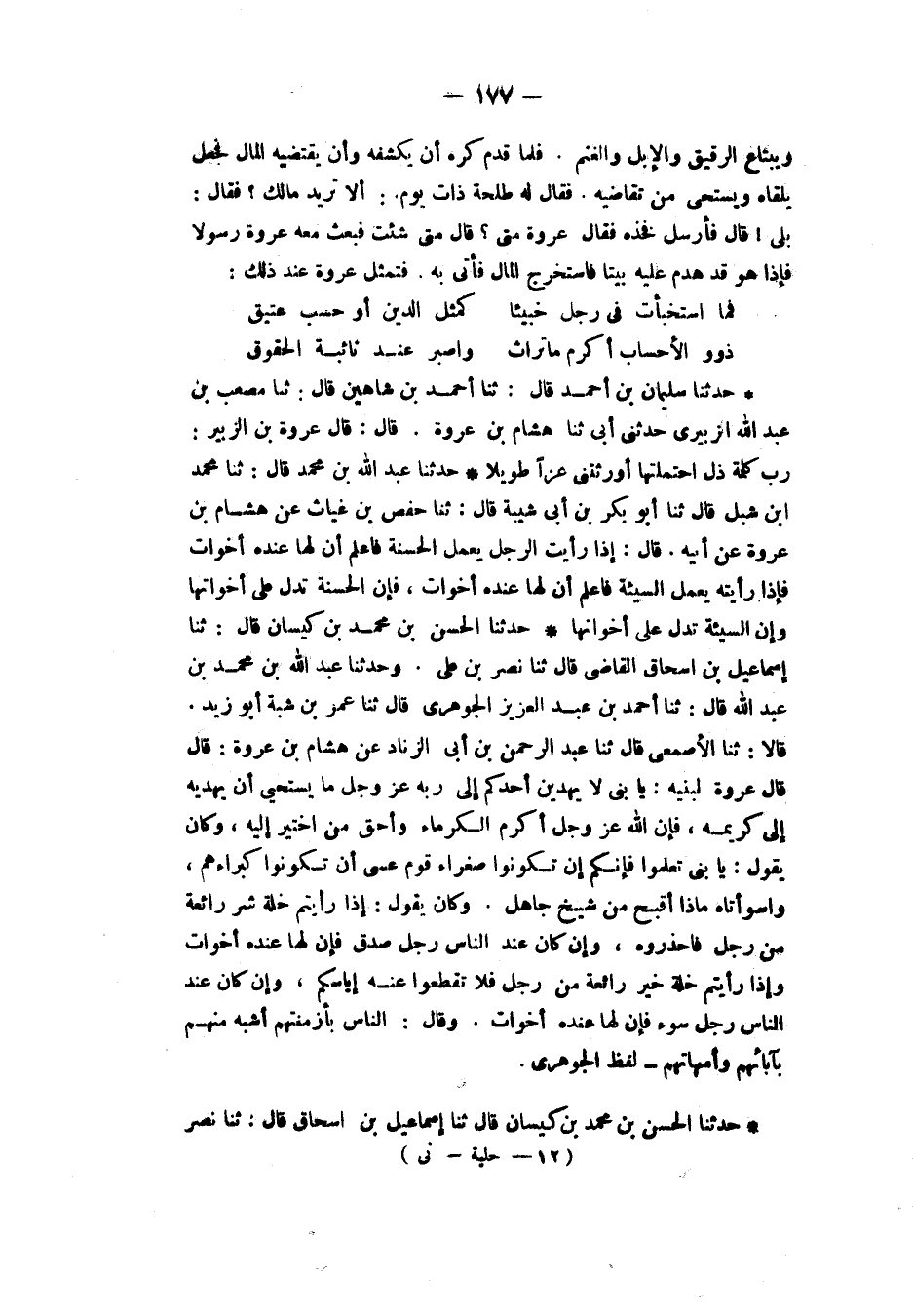 حَدَّثَنَا الْحَسَنُ بْنُ مُحَمَّدِ بْنِ كَيْسَانَ، قَالَ: ثنا إِسْمَاعِيلُ بْنُ إِسْحَاقَ، ثنا نَصْرُ -[178]- بْنُ عَلِيٍّ، قَالَ: ثنا الْأَصْمَعِيُّ، عَنِ ابْنِ أَبِي الزِّنَادِ، عَنْ هِشَامٍ، قَالَ: كَانَ عُرْوَةُ يَقُولُ: «§إِنِّي لَأَعْشَقُ الشَّرَفَ كَمَا أَعْشَقُ الْجَمَالَ، فَعَلَ اللهُ بِفُلَانَةَ أَلْفَتْ بَنِي فُلَانٍ وَهُمْ بِيضٌ طُوَالٌ فَقُلِبْتُمْ سُودًا قِصَارًا»