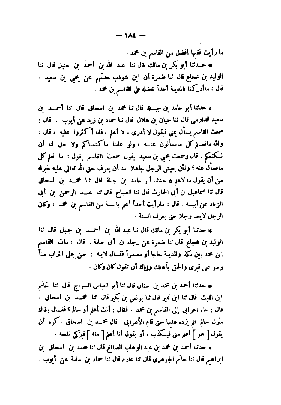 حَدَّثَنَا أَحْمَدُ بْنُ مُحَمَّدِ بْنِ عَبْدِ الْوَهَّابِ الصَّائِغُ، قَالَ: ثنا مُحَمَّدُ بْنُ إِسْحَاقَ بْنِ إِبْرَاهِيمَ، قَالَ: ثنا حَاتِمٌ الْجَوْهَرِيُّ، قَالَ: ثنا عَارِمٌ، قَالَ: ثنا حَمَّادُ بْنُ سَلَمَةَ، عَنْ أَيُّوبَ، -[185]- قَالَ: «§رَأَيْتُ عَلَى الْقَاسِمِ بْنِ مُحَمَّدٍ قَلَنْسُوَةً مِنْ خَزٍّ أَخْضَرَ وَرِدَاءً سَابِرِيًّا، لَهُ عَلَمٌ مُلَوَّنٌ مَصْبُوغٌ بِشَيْءٍ مِنْ زَعْفَرَانٍ وَيَدَعُ مِائَةَ أَلْفٍ يَتَلَجْلَجُ فِي نَفْسِهِ مِنْهَا شَيْءٌ» قَالَ الشَّيْخُ رَحِمَهُ اللهُ: أَسْنَدَ الْكَثِيرَ وَعَامَّةُ مَسَانِيدِهِ فِي الْمَنَاسِكِ وَالْأَحْكَامِ فَمِنْ مَفَارِيدِهِ وَغَرَائِبِ حَدِيثِهِ