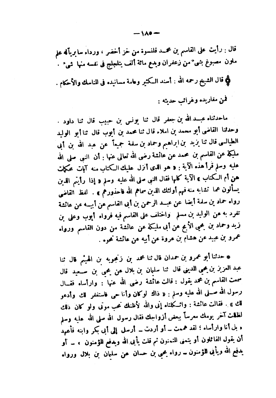 مَا حَدَّثَنَاهُ عَبْدُ اللهِ بْنُ جَعْفَرٍ، قَالَ: ثنا يُونُسُ بْنُ حَبِيبٍ، قَالَ: ثنا دَاوُدُ، وَحَدَّثَنَا الْقَاضِي أَبُو مُحَمَّدِ بْنُ أَحْمَدَ إِمْلَاءً قَالَ: ثنا مُحَمَّدُ بْنُ أَيُّوبَ، قَالَ: ثنا أَبُو الْوَلِيدِ الطَّيَالِسِيُّ، قَالَ: ثنا يَزِيدُ بْنُ إِبْرَاهِيمَ، وَحَمَّادُ بْنُ سَلَمَةَ، جَمِيعًا عَنْ عَبْدِ اللهِ بْنِ أَبِي مُلَيْكَةَ، عَنِ الْقَاسِمِ بْنِ مُحَمَّدٍ، عَنْ عَائِشَةَ، رَضِيَ اللهُ تَعَالَى عَنْهَا أَنَّ النَّبِيَّ صَلَّى اللهُ عَلَيْهِ وَسَلَّمَ قَرَأَ هَذِهِ الْآيَةَ: {هُوَ الَّذِي أَنْزَلَ عَلَيْكَ الْكِتَابَ مِنْهُ آيَاتٌ مُحْكَمَاتٌ هُنَّ أُمُّ الْكِتَابِ} [آل عمران: 7] الْآيَةَ كُلَّهَا فَقَالَ النَّبِيُّ صَلَّى اللهُ عَلَيْهِ وَسَلَّمَ: «§إِذَا رَأَيْتُمُ الَّذِينَ يَسْأَلُونَ عَمَّا تَشَابَهَ مِنْهُ فَهُمْ أُولَئِكَ الَّذِينَ سَمَّاهُمُ اللهُ فَاحْذَرُوهُمْ» لَفْظُ الْقَاضِي رَوَاهُ حَمَّادُ بْنُ سَلَمَةَ أَيْضًا عَنْ عَبْدِ الرَّحْمَنِ بْنِ الْقَاسِمِ، عَنْ أَبِيهِ، عَنْ عَائِشَةَ تَفَرَّدَ بِهِ عَنِ الْوَلِيدِ بْنِ مُسْلِمٍ وَاخْتُلِفَ عَلَى الْقَاسِمِ فِيهِ فَرَوَاهُ أَيُّوبُ، وَعَلِيُّ بْنُ زَيْدٍ، وَحَمَّادُ بْنُ يَحْيَى الْأَبَحُّ، عَنْ أَبِي مُلَيْكَةَ، عَنْ عَائِشَةَ، مِنْ دُونِ الْقَاسِمِ وَرَوَاهُ عَمْرُو بْنُ عُبَيْدِ اللهِ، عَنْ هِشَامِ بْنِ عُرْوَةَ، عَنْ أَبِيهِ، عَنْ عَائِشَةَ نَحْوَهُ