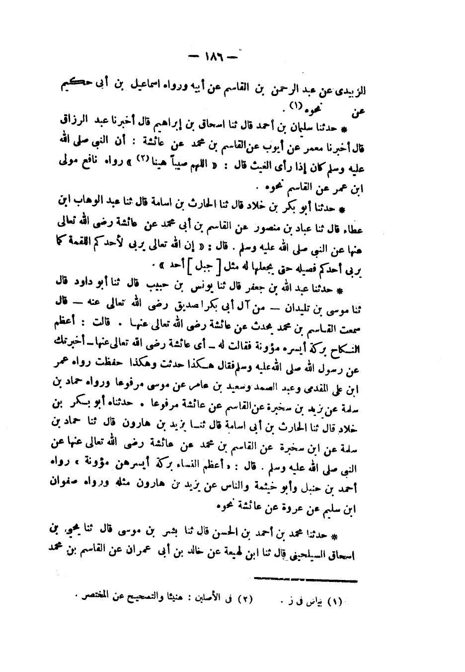 حَدَّثَنَا أَبُو بَكْرِ بْنُ خَلَّادٍ، قَالَ: ثنا الْحَارِثُ بْنُ أَبِي أُسَامَةَ، قَالَ: ثنا يَزِيدُ بْنُ هَارُونَ، قَالَ: ثنا حَمَّادُ بْنُ سَلَمَةَ، عَنِ ابْنِ سَخْبَرَةَ، عَنِ الْقَاسِمِ بْنِ مُحَمَّدٍ، عَنْ عَائِشَةَ، رَضِيَ اللهُ تَعَالَى عَنْهَا عَنِ النَّبِيِّ صَلَّى اللهُ عَلَيْهِ وَسَلَّمَ قَالَ: «§أَعْظَمُ النِّسَاءِ بَرَكَةً أَيْسَرُهُنَّ مَئُونَةً» رَوَاهُ أَحْمَدُ بْنُ حَنْبَلٍ، وَأَبُو خَيْثَمَةَ وَالنَّاسُ عَنْ يَزِيدَ بْنِ هَارُونَ مِثْلَهُ وَرَوَاهُ صَفْوَانُ بْنُ سُلَيْمٍ، عَنْ عُرْوَةَ، عَنْ عَائِشَةَ نَحْوَهُ