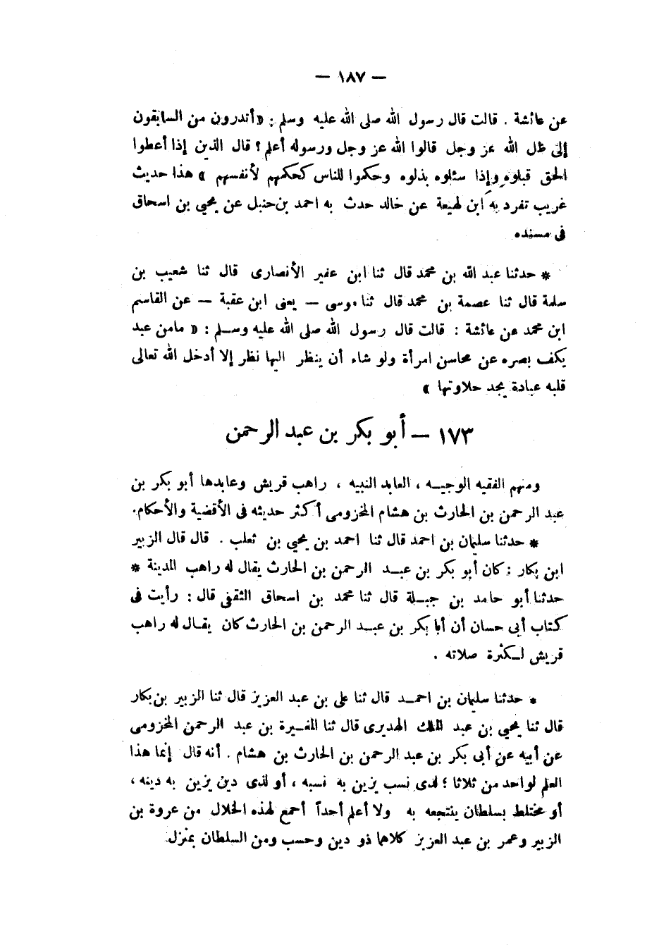 حَدَّثَنَا سُلَيْمَانُ بْنُ أَحْمَدَ، قَالَ: ثنا أَحْمَدُ بْنُ يَحْيَى بْنِ ثَعْلَبٍ، قَالَ: قَالَ الزُّبَيْرُ بْنُ بَكَّارٍ: " §كَانَ أَبُو بَكْرِ بْنُ عَبْدِ الرَّحْمَنِ بْنِ الْحَارِثِ يُقَالُ لَهُ: رَاهِبُ الْمَدِينَةِ "