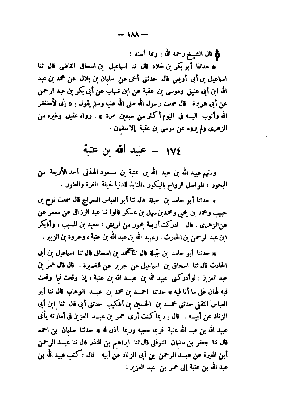 §عُبَيْدُ اللهِ بْنُ عُتْبَةَ وَمِنْهُمْ عُبَيْدُ اللهِ بْنُ عَبْدِ اللهِ بْنِ عُتْبَةَ بْنِ مَسْعُودٍ الْهُذَلِيُّ أَحَدُ الْأَرْبَعَةِ مِنَ الْبُحُورِ، الْمُوَاصِلُ الرَّوَاحُ بِالْبُكُورِ الْمُنَابِذُ لِلدُّنْيَا خِيفَةَ الْغُرَّةِ وَالْعُثُورِ