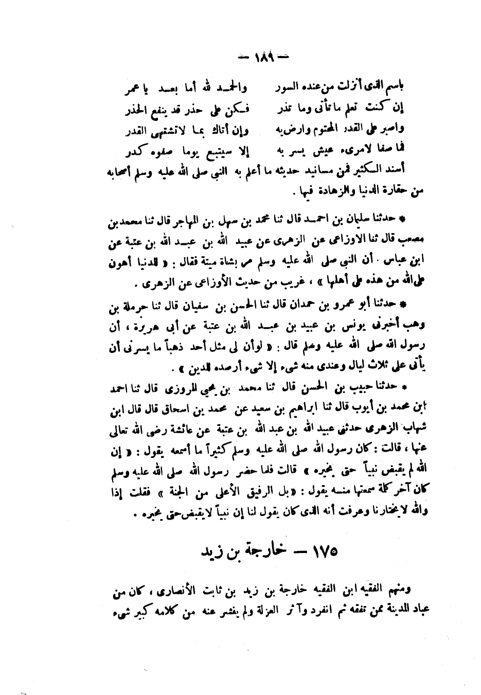 §خَارِجَةُ بْنُ زَيْدٍ وَمِنْهُمُ الْفَقِيهُ ابْنُ الْفَقِيهِ خَارِجَةُ بْنُ زَيْدِ بْنِ ثَابِتٍ الْأَنْصَارِيُّ كَانَ مِنْ عُبَّادِ الْمَدِينَةِ مِمَّنْ تَفَقَّهَ ثُمَّ انْفَرَدَ وَآثَرَ الْعُزْلَةَ وَلَمْ يُنْشَرْ عَنْهُ مِنْ كَلَامِهِ كَبِيرُ شَيْءٍ -[190]- عَامَّةُ حَدِيثِهِ فِي الْأَقْضِيَةِ وَالْأَحْكَامِ فَمِمَّا أَسْنَدَهُ مَا