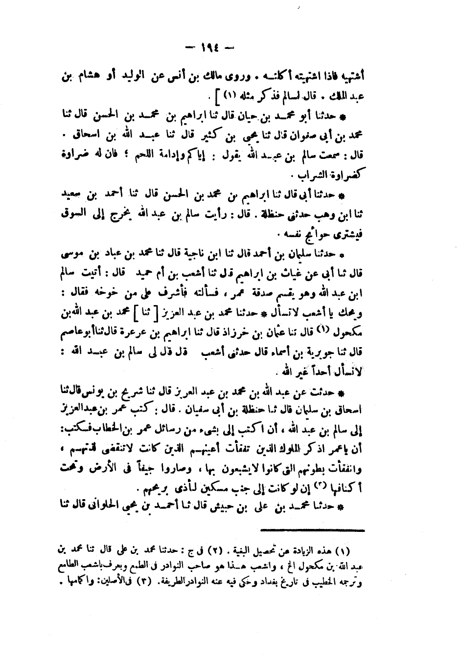 حَدَّثَنَا أَبُو مُحَمَّدِ بْنُ حَيَّانَ، قَالَ: ثنا إِبْرَاهِيمُ بْنُ مُحَمَّدِ بْنِ الْحَسَنِ، قَالَ: ثنا مُحَمَّدُ بْنُ أَبِي صَفْوَانَ، قَالَ: ثنا يَحْيَى بْنُ كَثِيرٍ، قَالَ: ثنا عَبْدُ اللهِ بْنُ إِسْحَاقَ، قَالَ: سَمِعْتُ سَالِمَ بْنَ عَبْدِ اللهِ، يَقُولُ: «§إِيَّاكُمْ وَإِدَامَةَ اللَّحْمِ فَإِنَّ لَهُ ضَرَاوَةً كَضَرَاوَةِ الشَّرَابِ»
