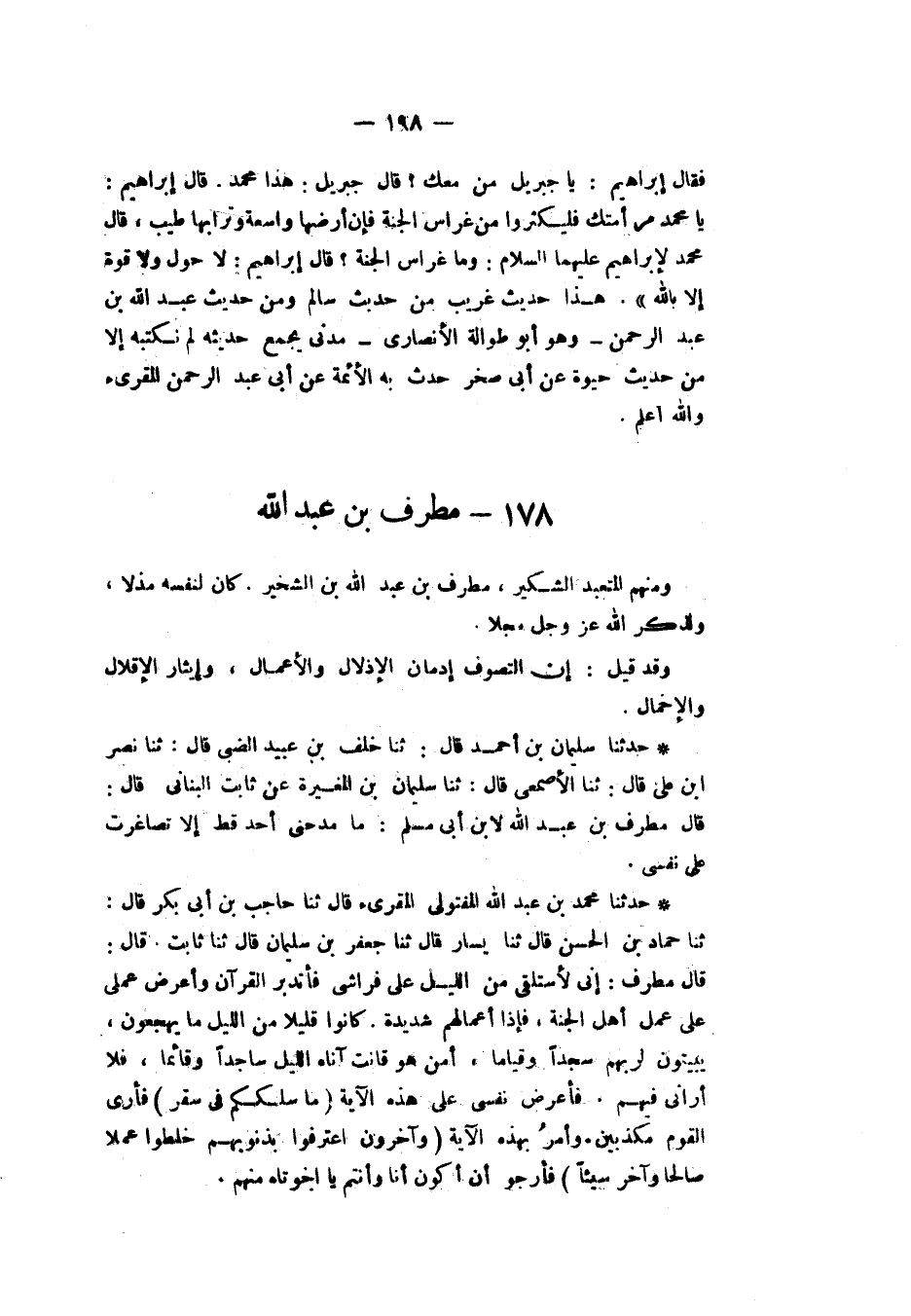 §مُطَرِّفُ بْنُ عَبْدِ اللهِ وَمِنْهُمُ الْمُتَعَبِّدُ الشِّكِّيرُ مُطَرِّفُ بْنُ عَبْدِ اللهِ بْنِ الشِّخِّيرِ، كَانَ لِنَفْسِهِ مُذِلًّا وَلِذِكْرِ اللهِ عَزَّ وَجَلَّ مُجِلًّا وَقَدْ قِيلَ: إِنَّ التَّصَوُّفَ إِدْمَانُ الْإِذْلَالِ وَالْأَعْمَالِ، وَإِيثَارُ الْإِقْلَالِ وَالْإِخْمَالِ